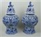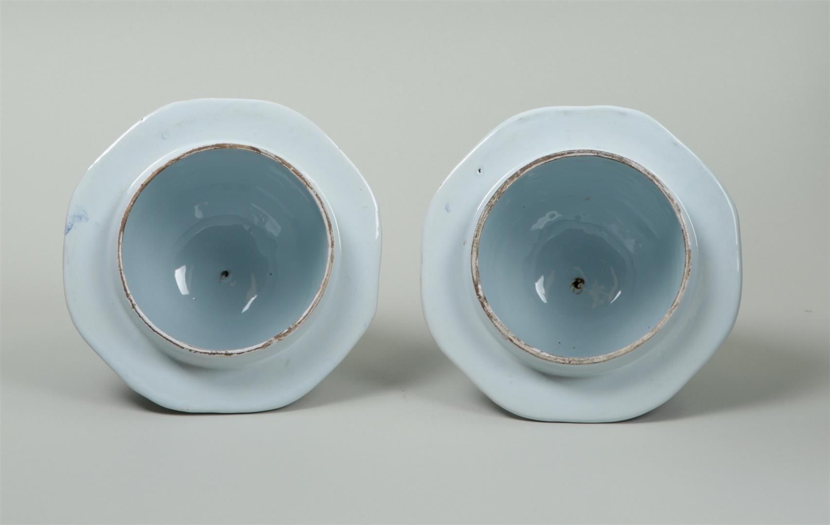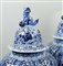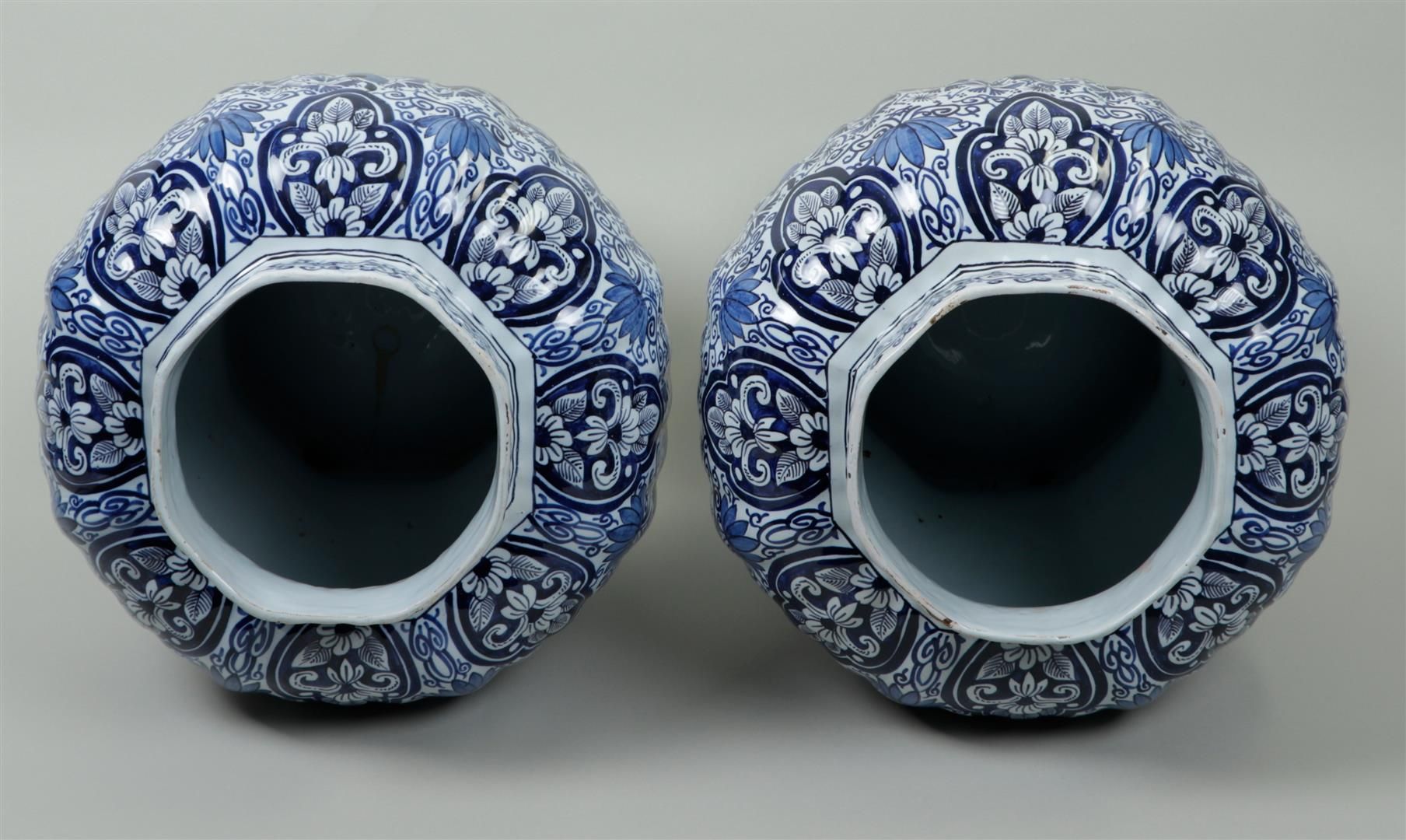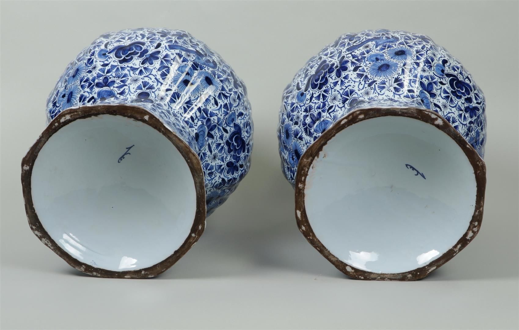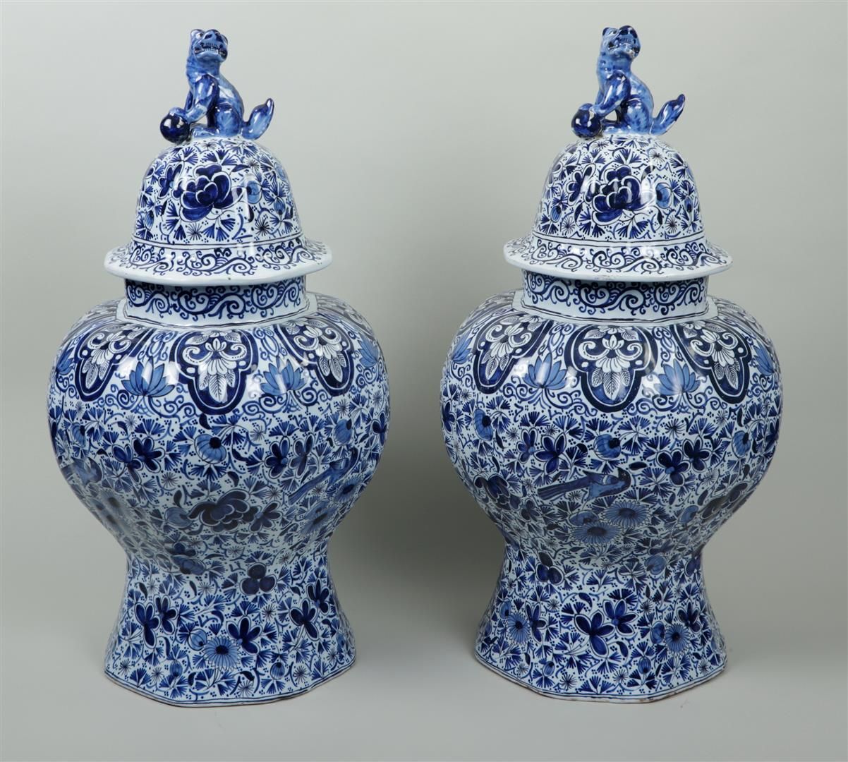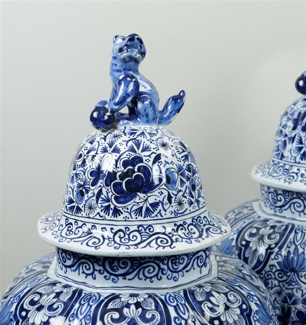 A set of capital earthenware covered vases with floral decoration and foo dogs on the lid, marked de Porceleyne claeuw. Delft, 19th century.