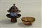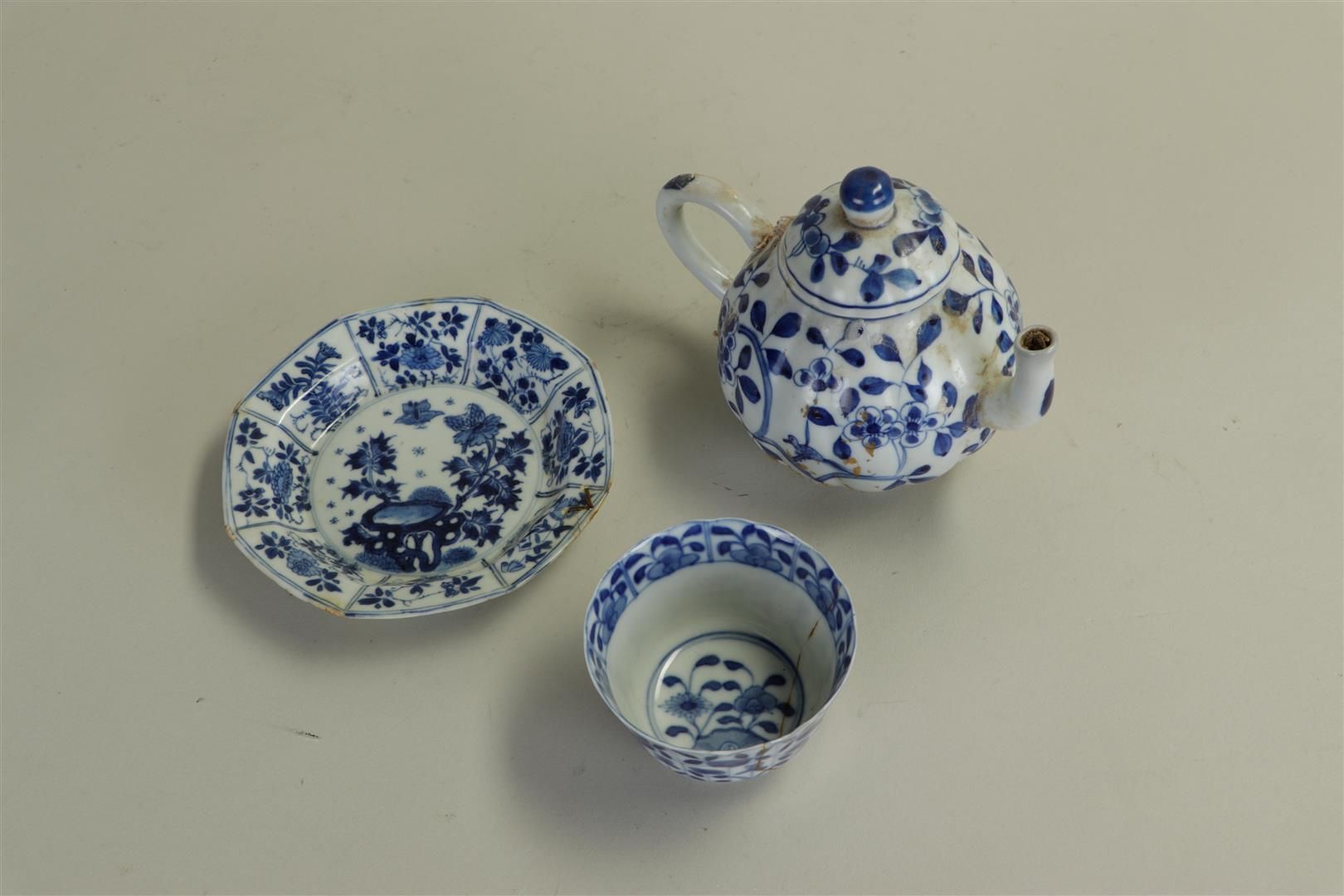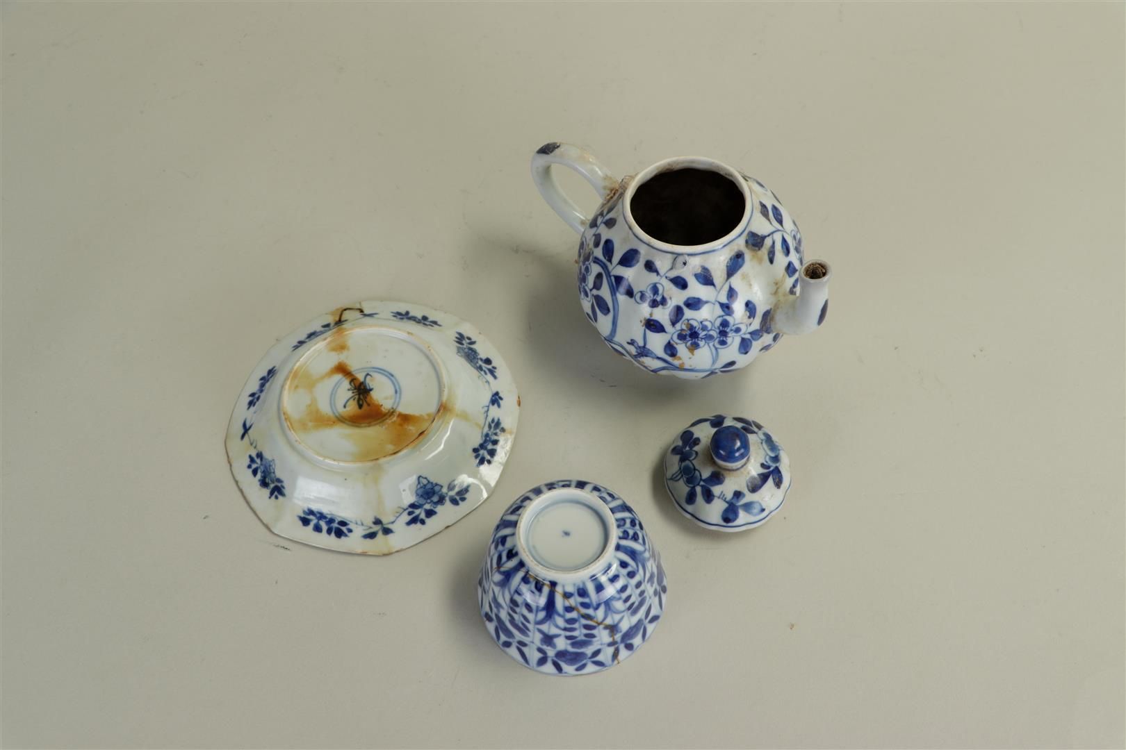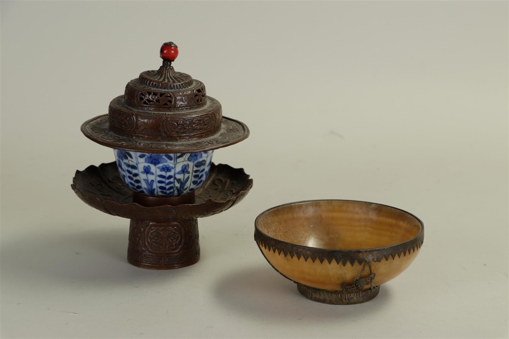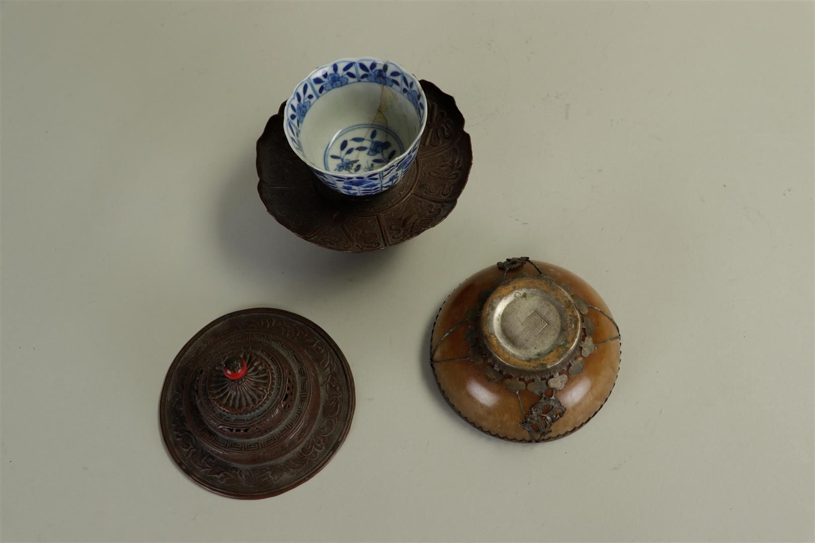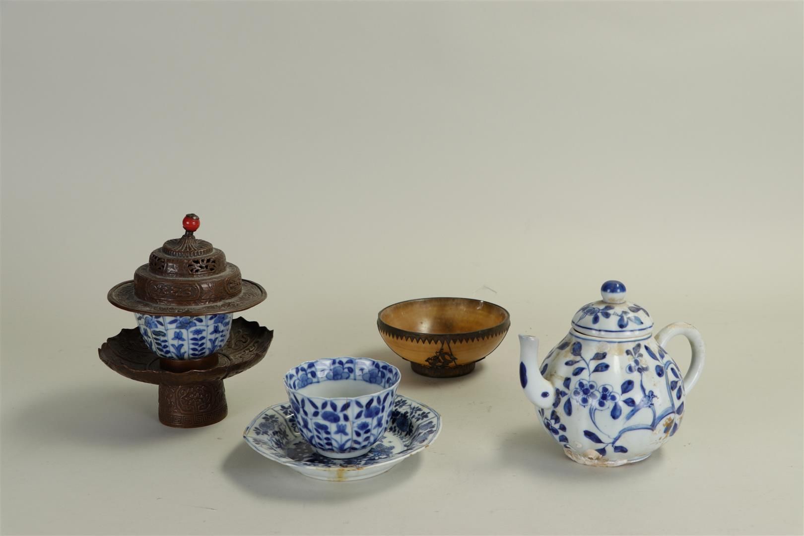 A lot of various Asian items including a teapot, a soapstone bowl with bronze mounts (marked on the bottom), and various cups. Some glued, the pot is a wreck find and has barnacles. Teapot: h.: 12.5 incl. lid.