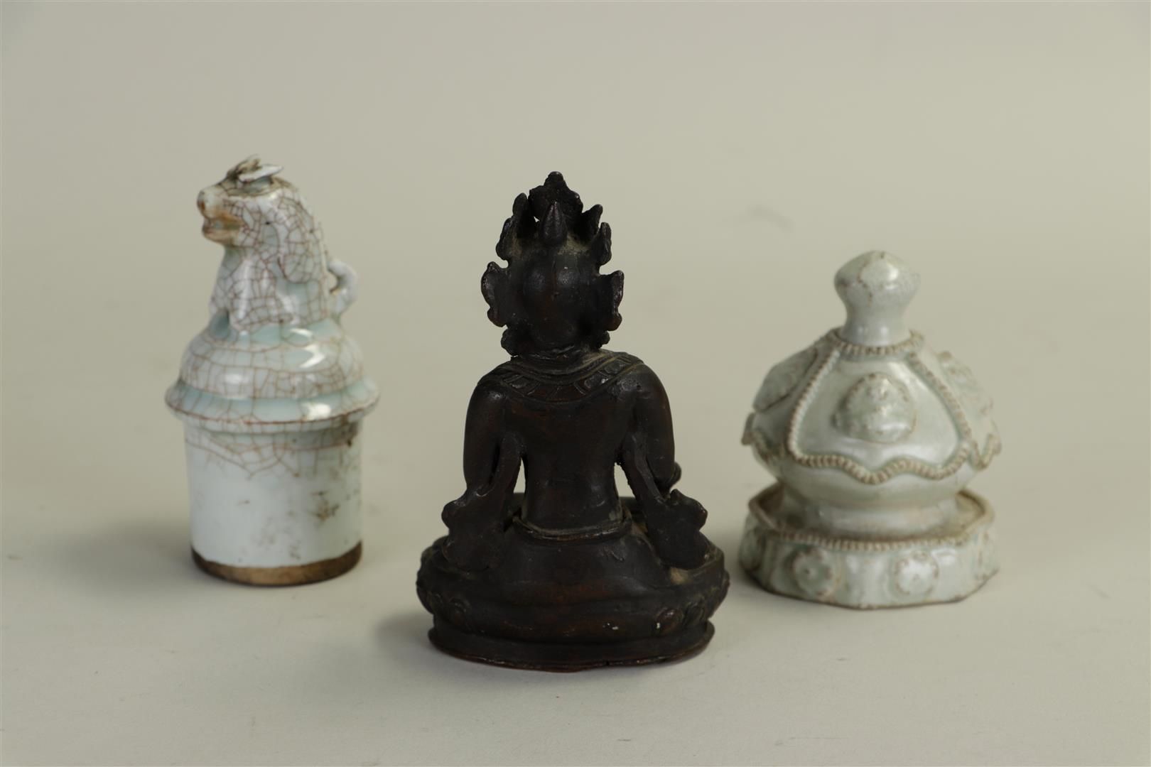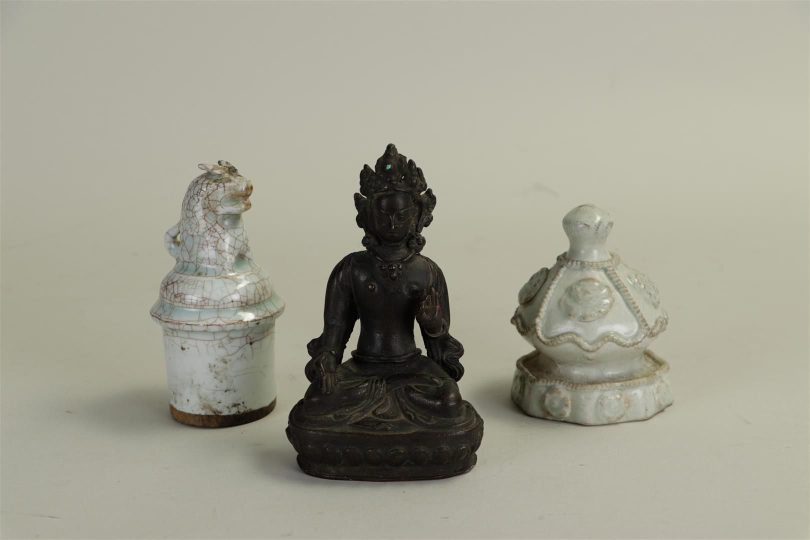 A lot consisting of a bronze Buddha with turquoise gemstone in crown, possibly Ming and two porcelain lids / stoppers, one of which is Quing-bai.