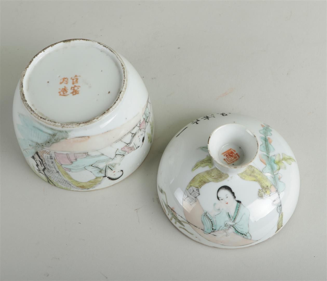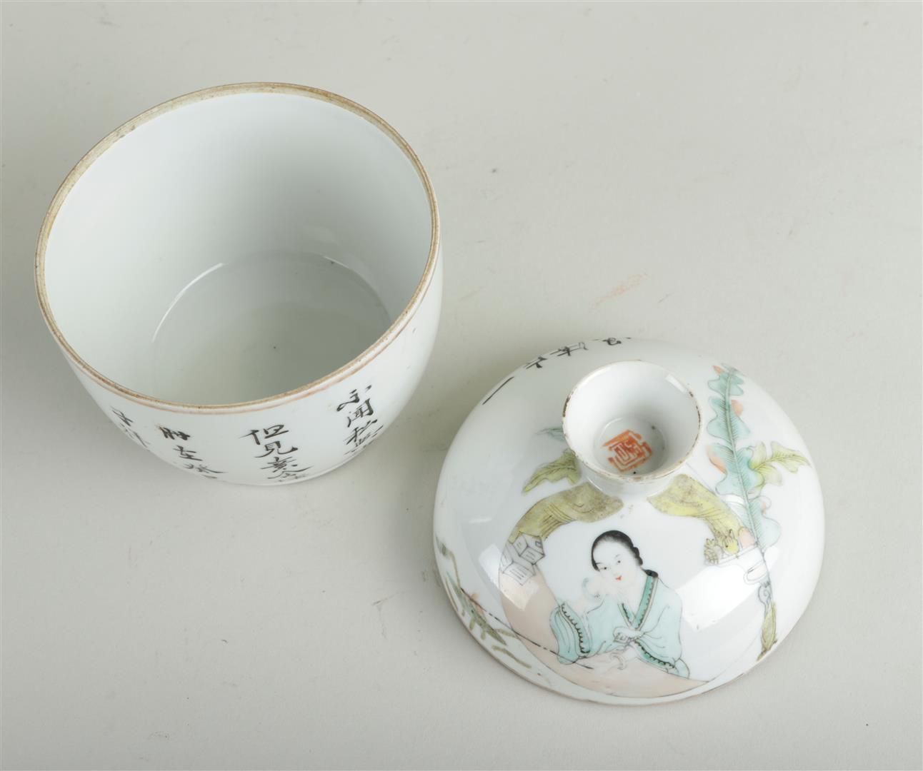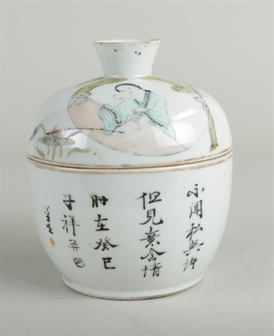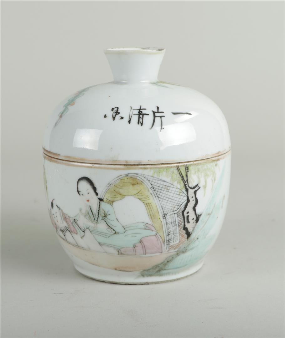 A Qianjiang porcelain covered jar decorated with various figures and text on...