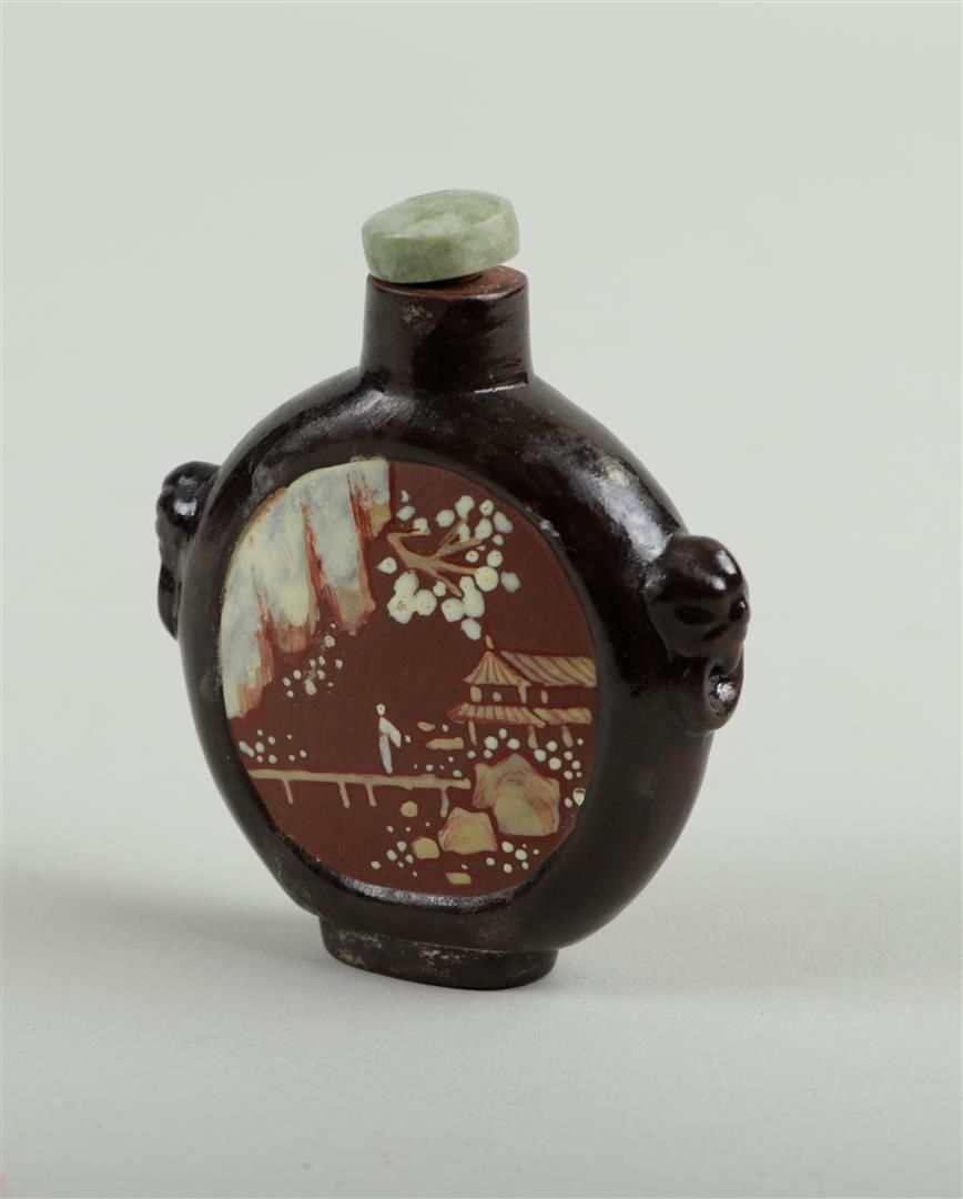 A Yixing snuff bottle with landscape decoration. China, 19th century.