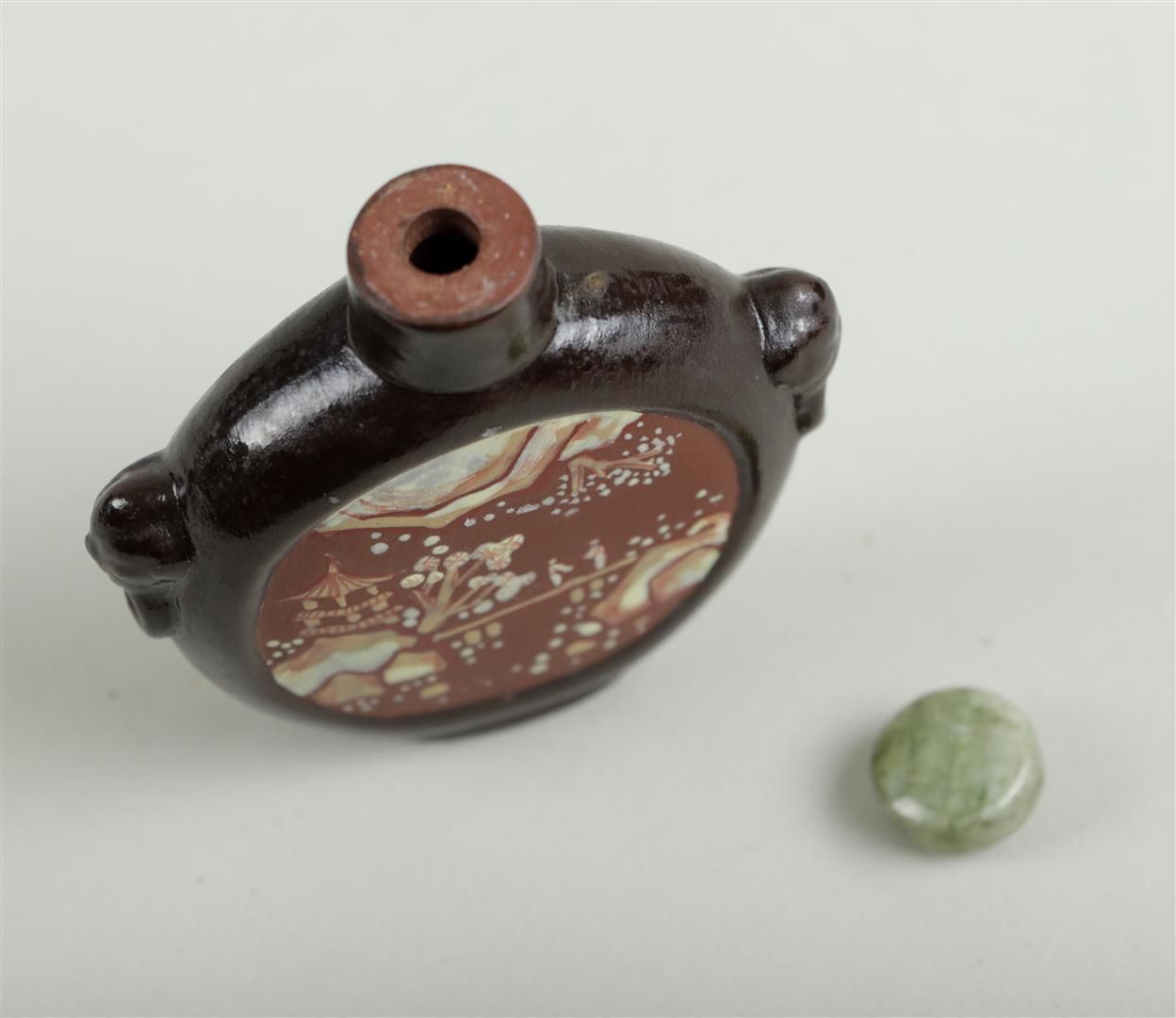 A Yixing snuff bottle with landscape decoration. China, 19th century.H. 8 cm.