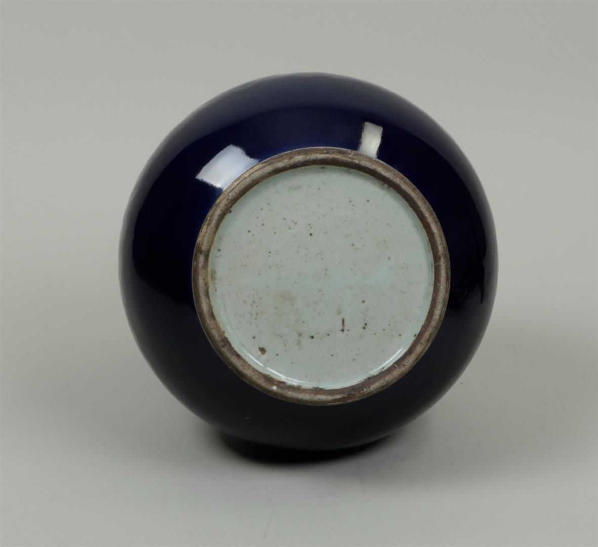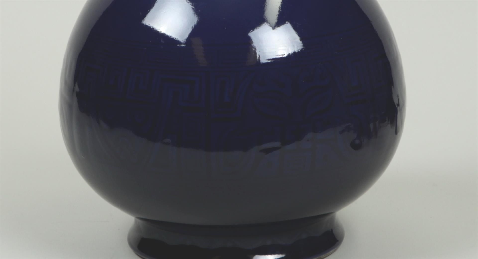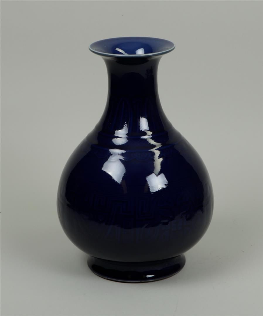 A monochrome blue vase with relief decoration. China, 20th century.H. 31 cm.