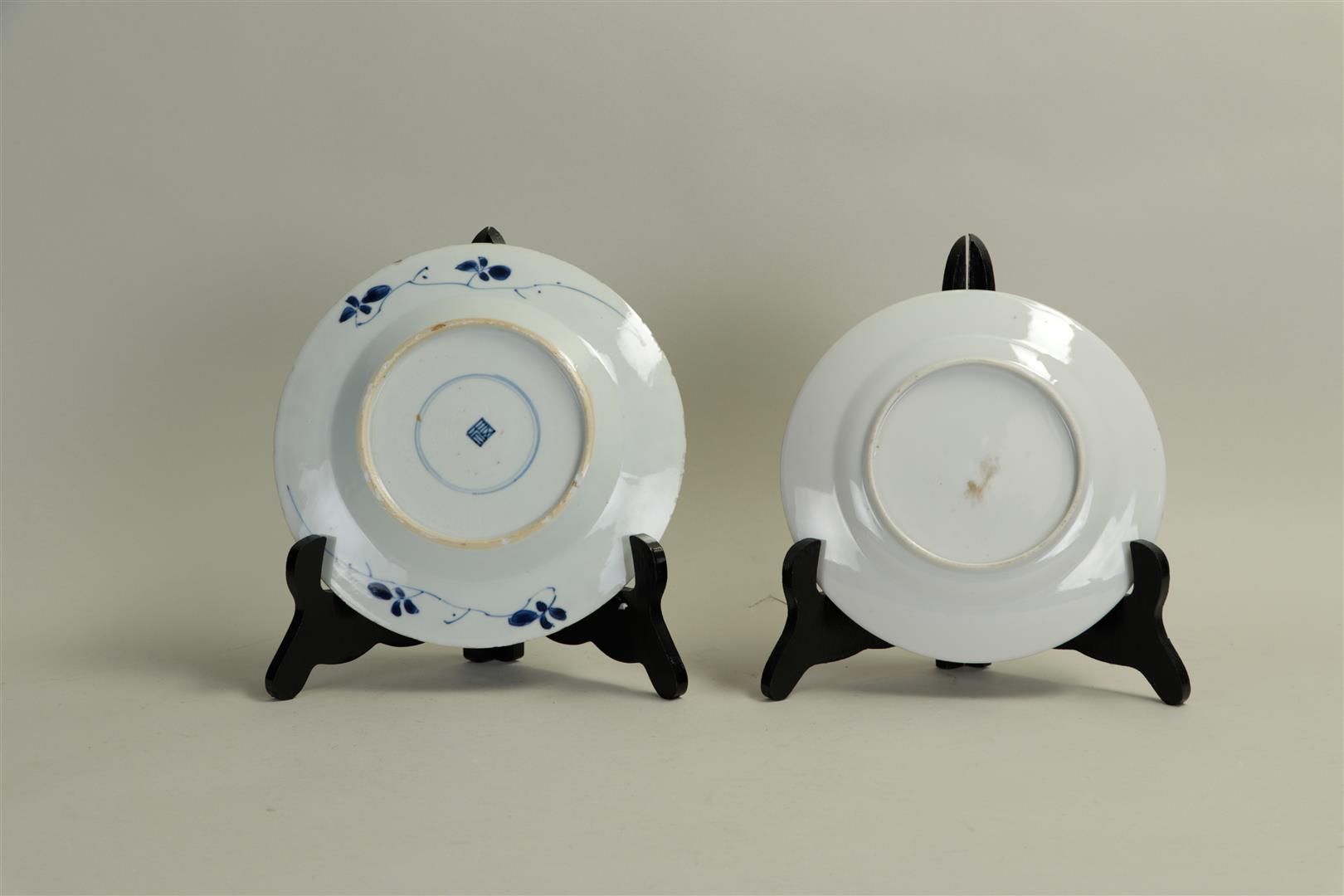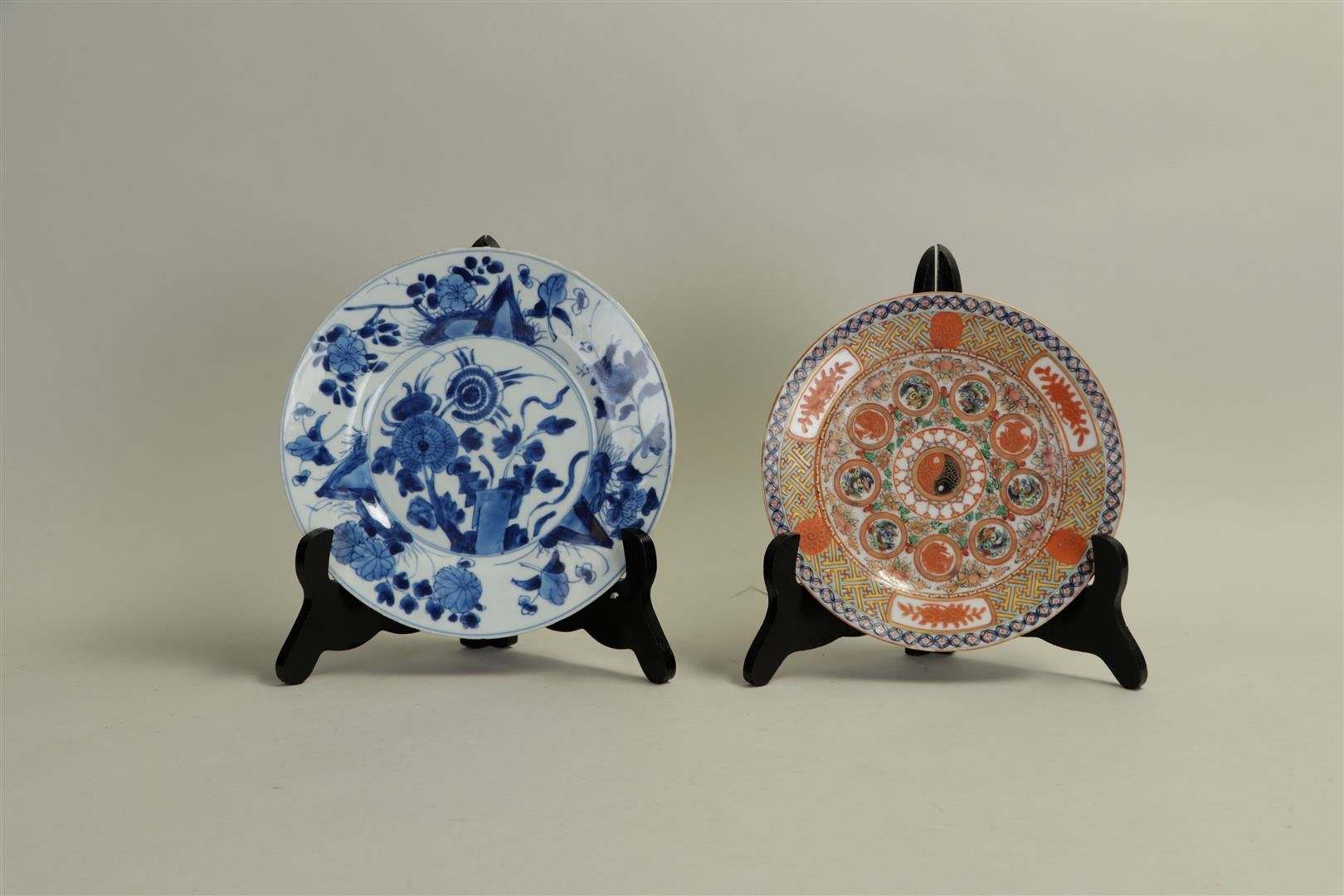 A lot of porcelain plates including a 19th century polychrome plate and a Kangxi plate with floral decoration. China, 18/19th century. One plate with edge damage.