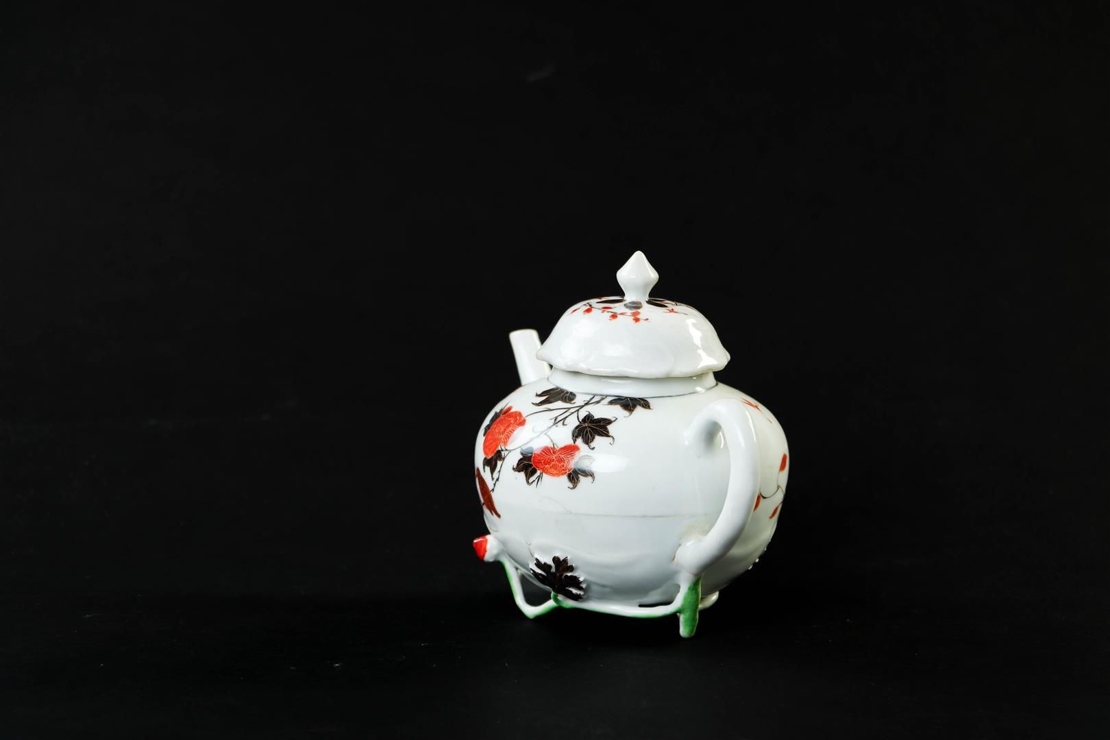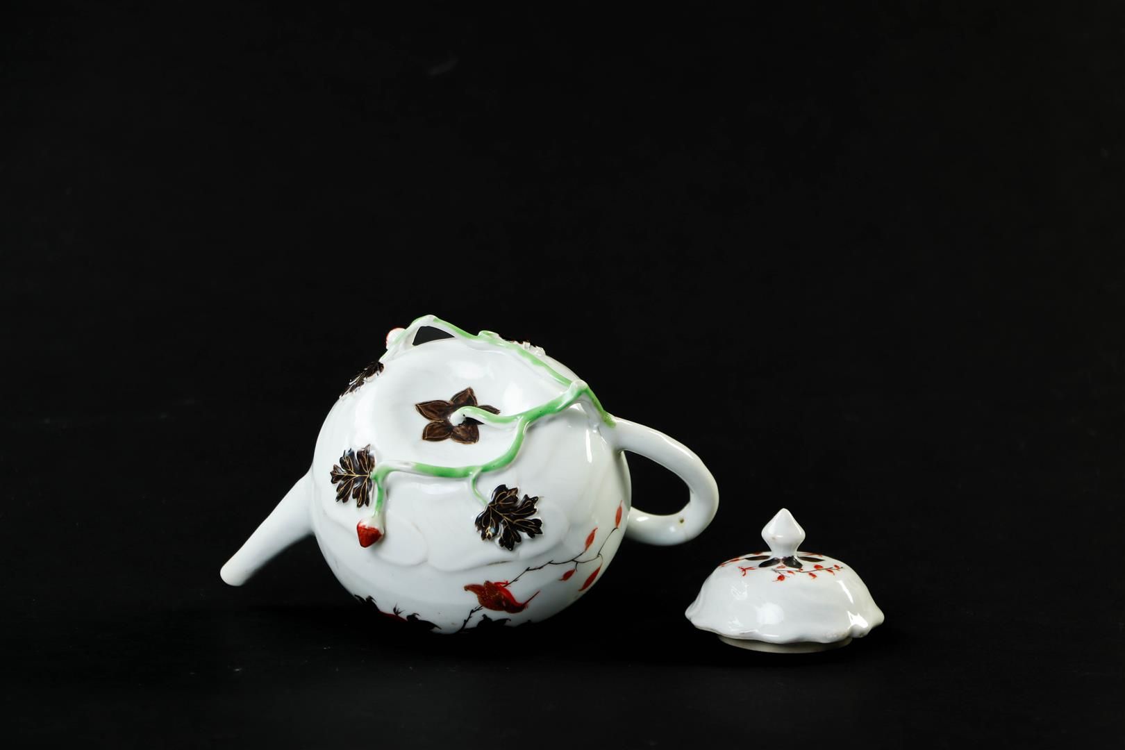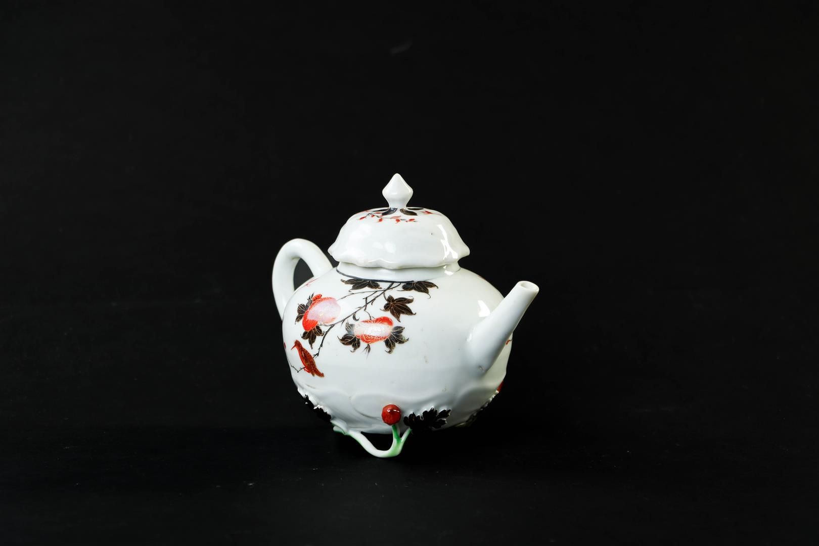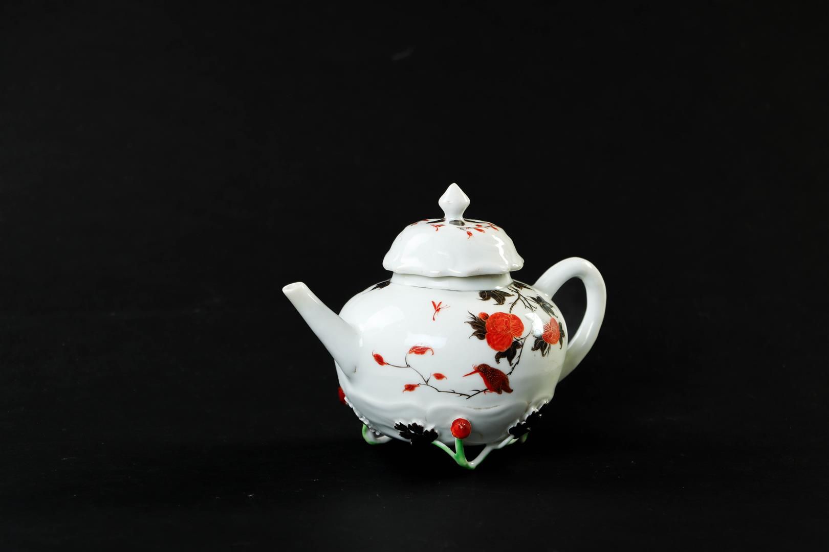 A porcelain teapot with cherry blossoms, bird on branch, lid in lotus shape, gravito decoration lid. China, Yongzheng.