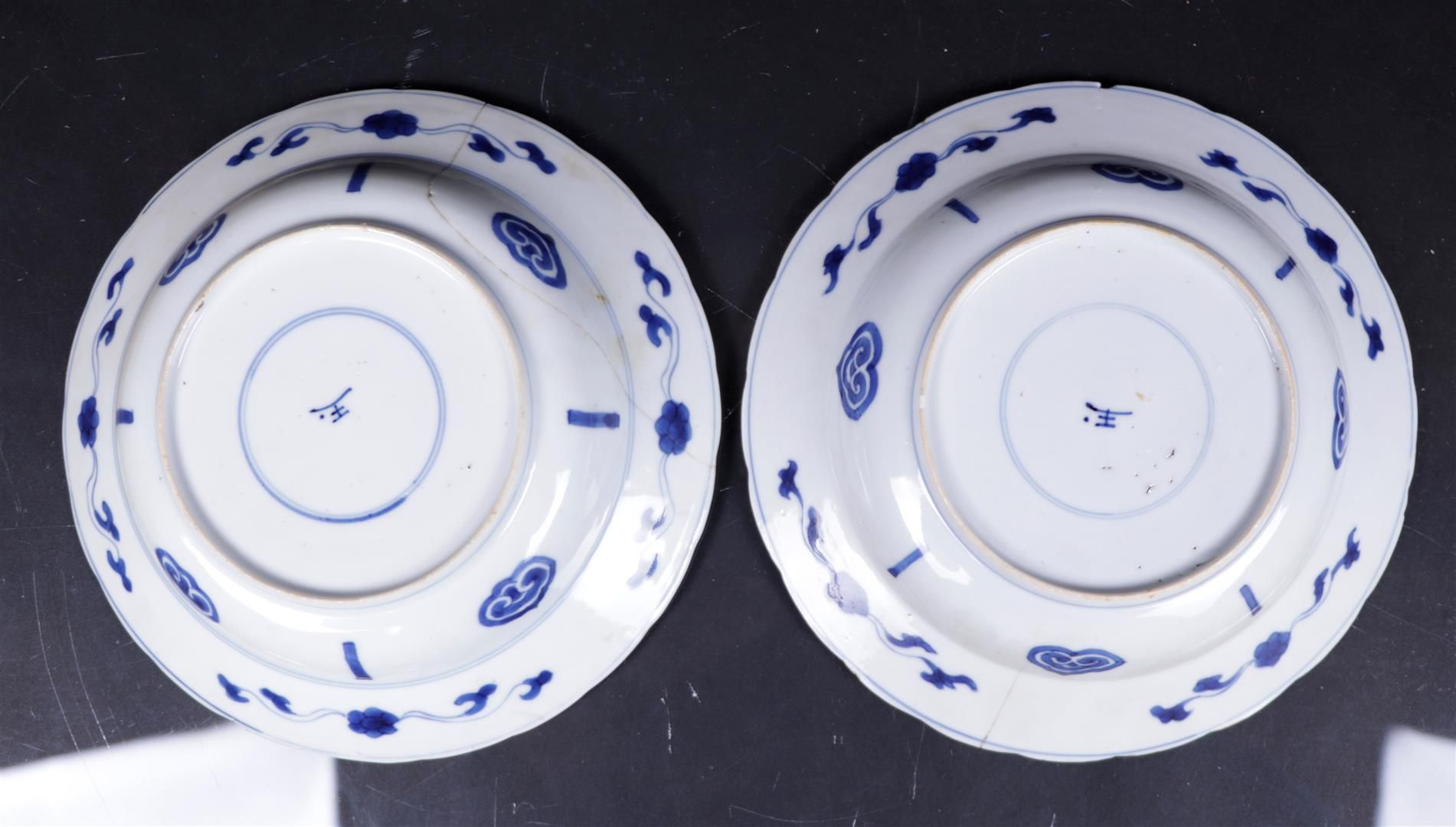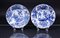 Two porcelain hooded plates with antique borders on the outside alternating with floral borders, between which swasticas, the center with rich floral decoration with insects, the back marked Jade. China, Kangxi.