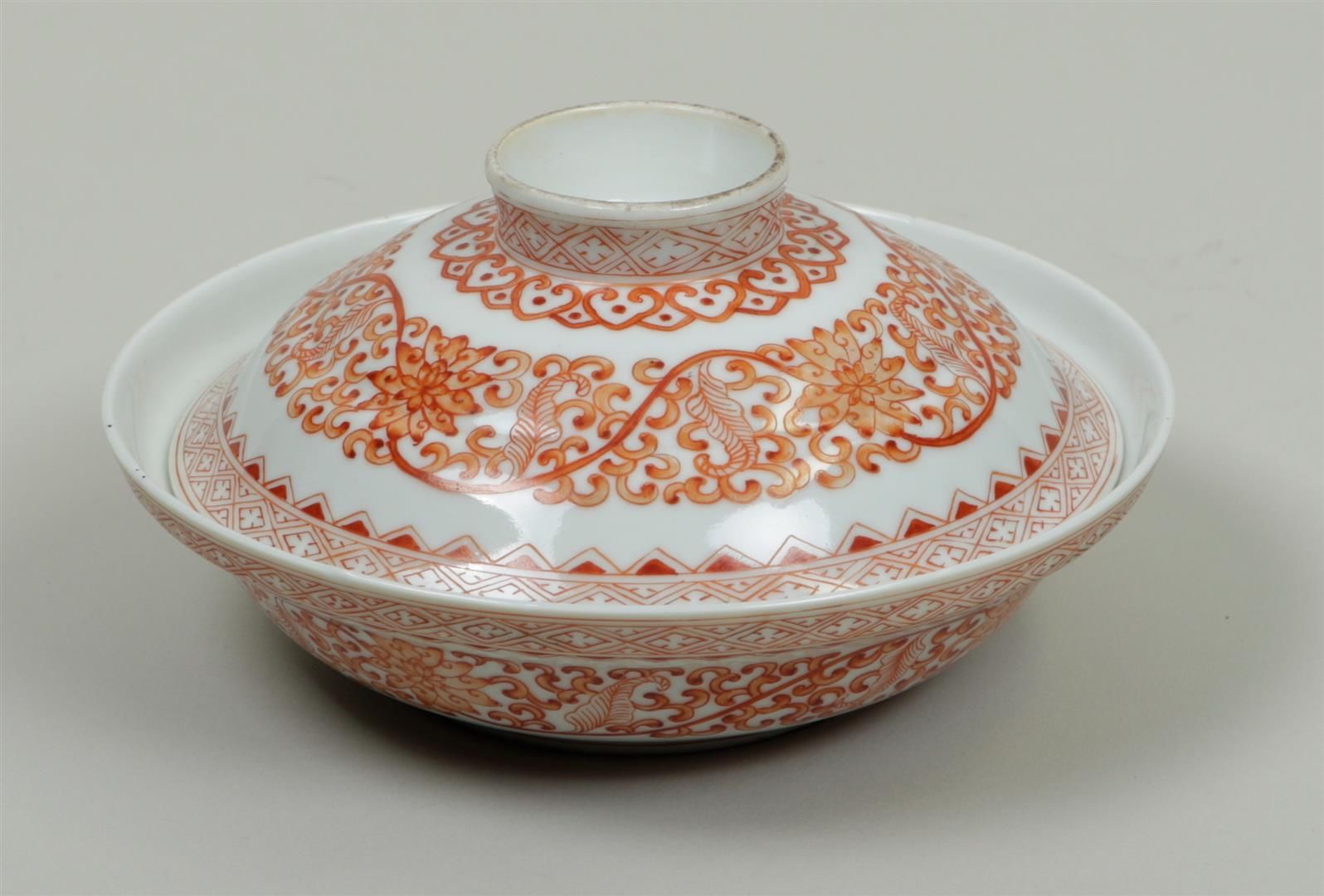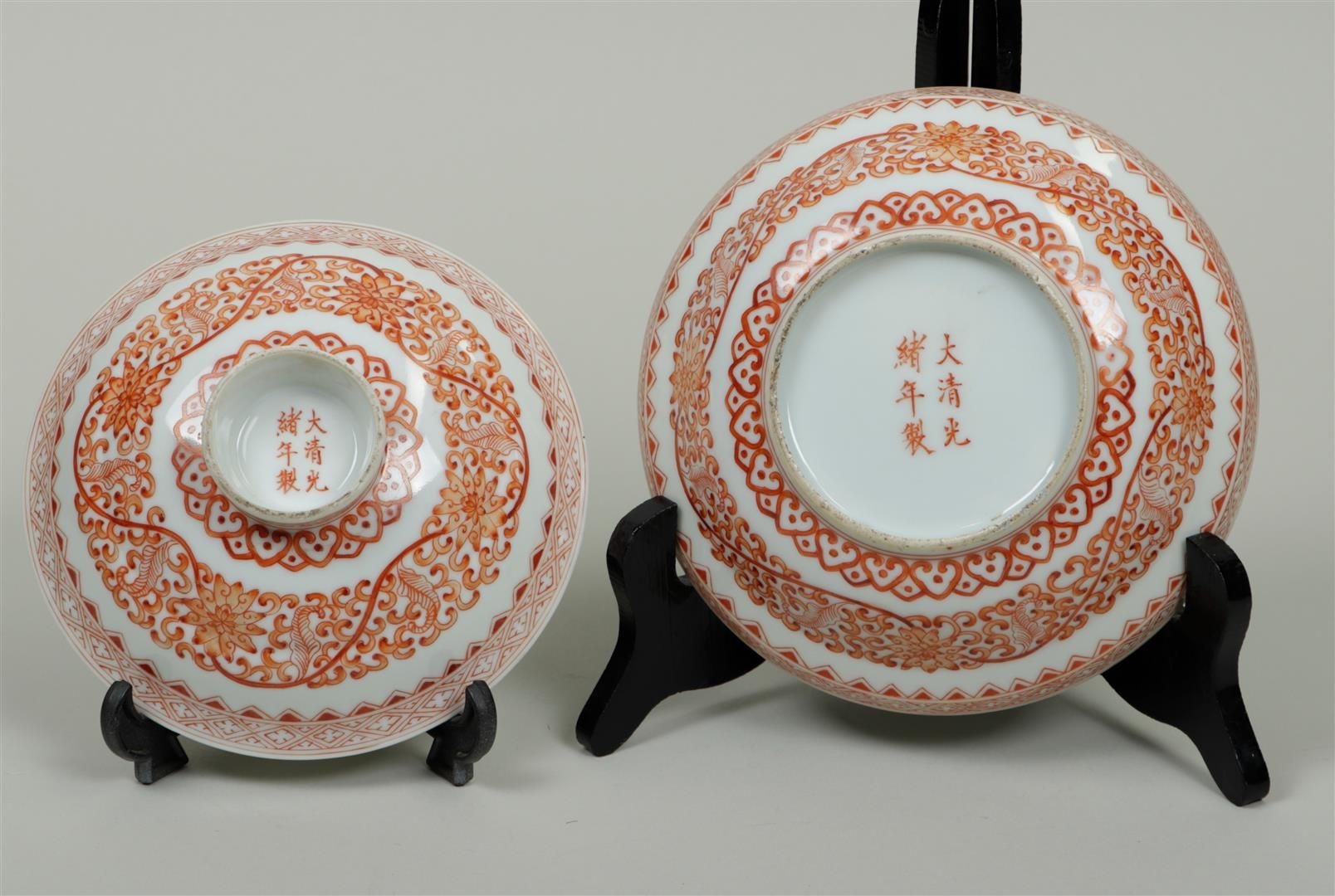 A porcelain covered bowl and dish in iron red decor, marked Guanxu. China,...
