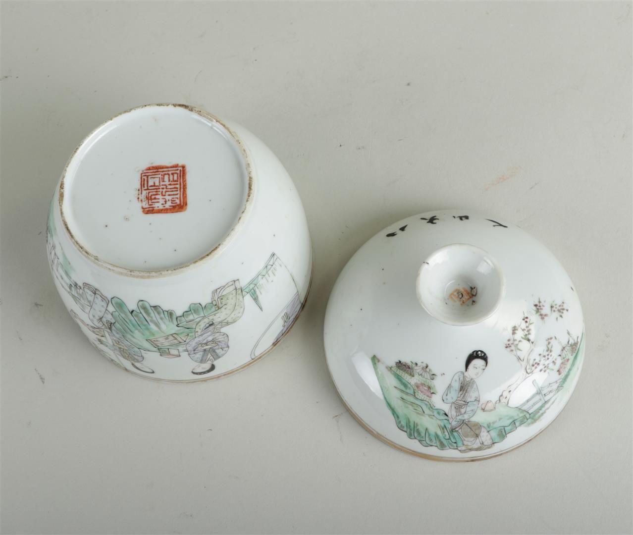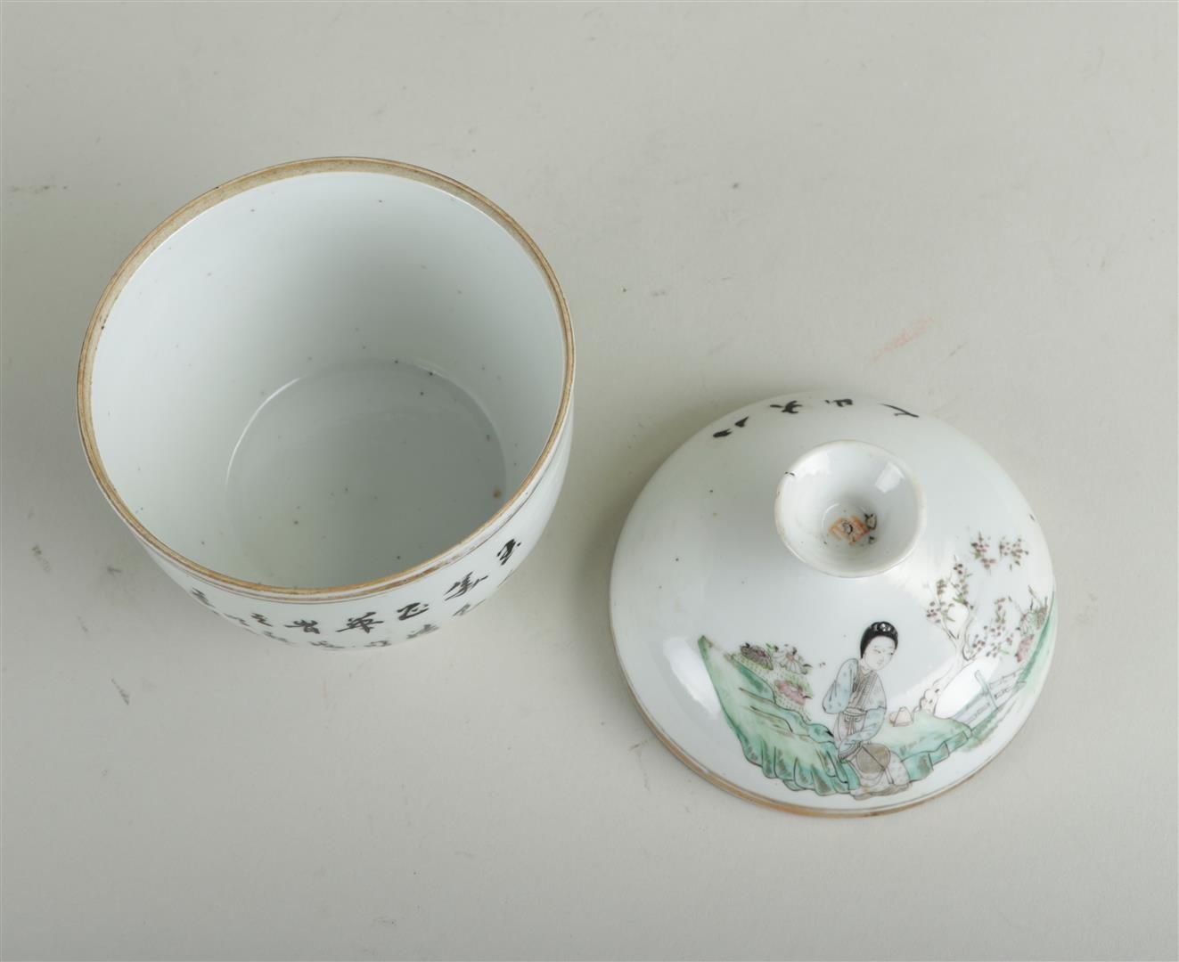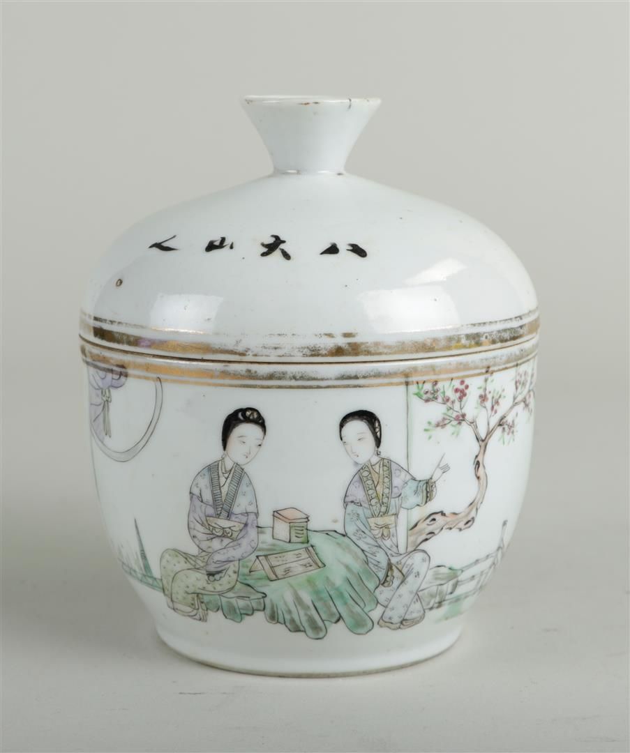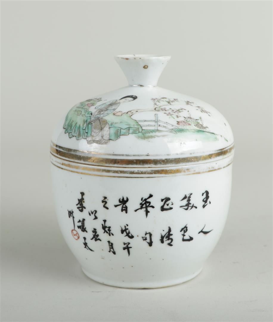 A Qianjiang porcelain covered jar decorated with various figures and text on...