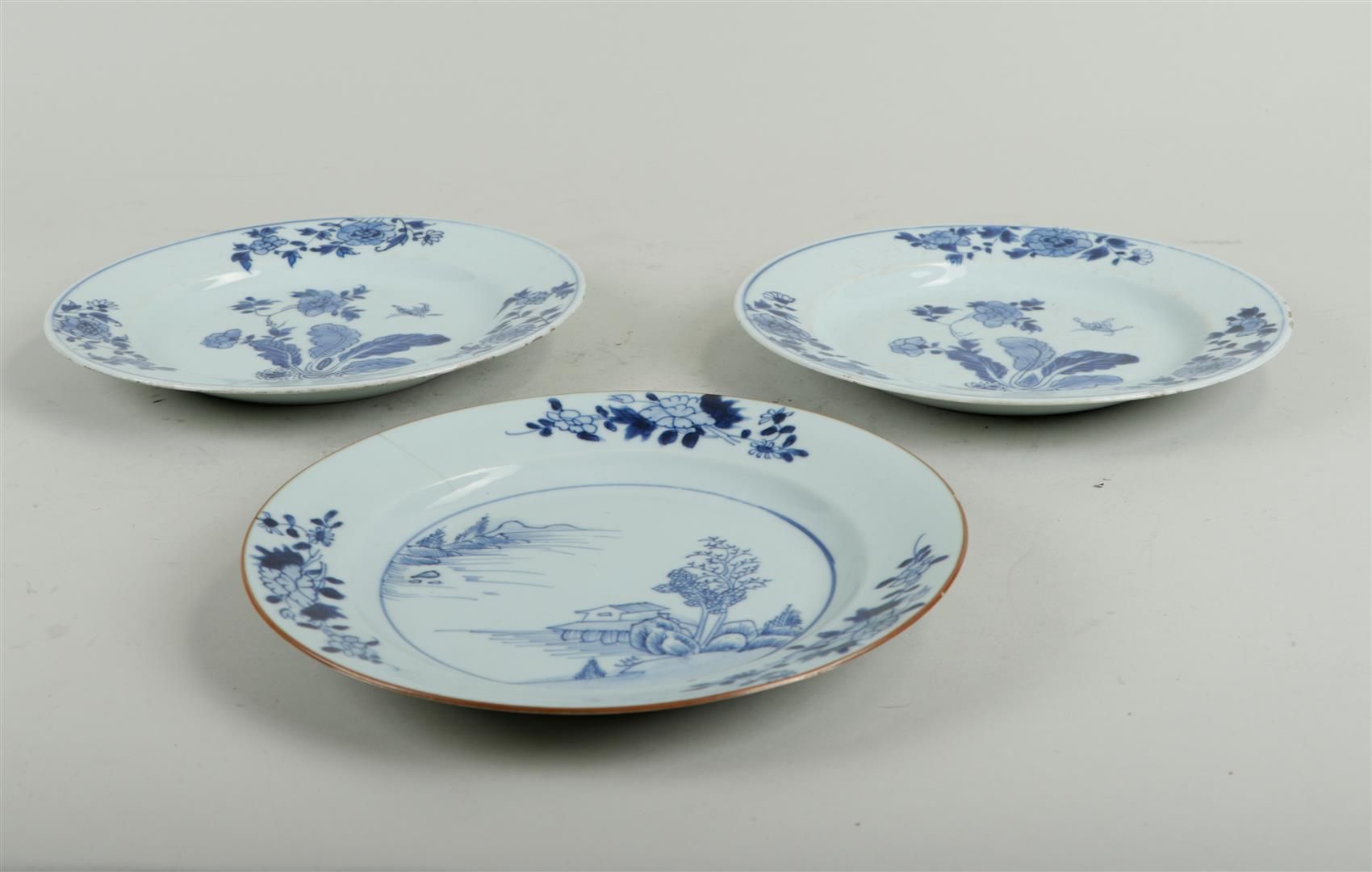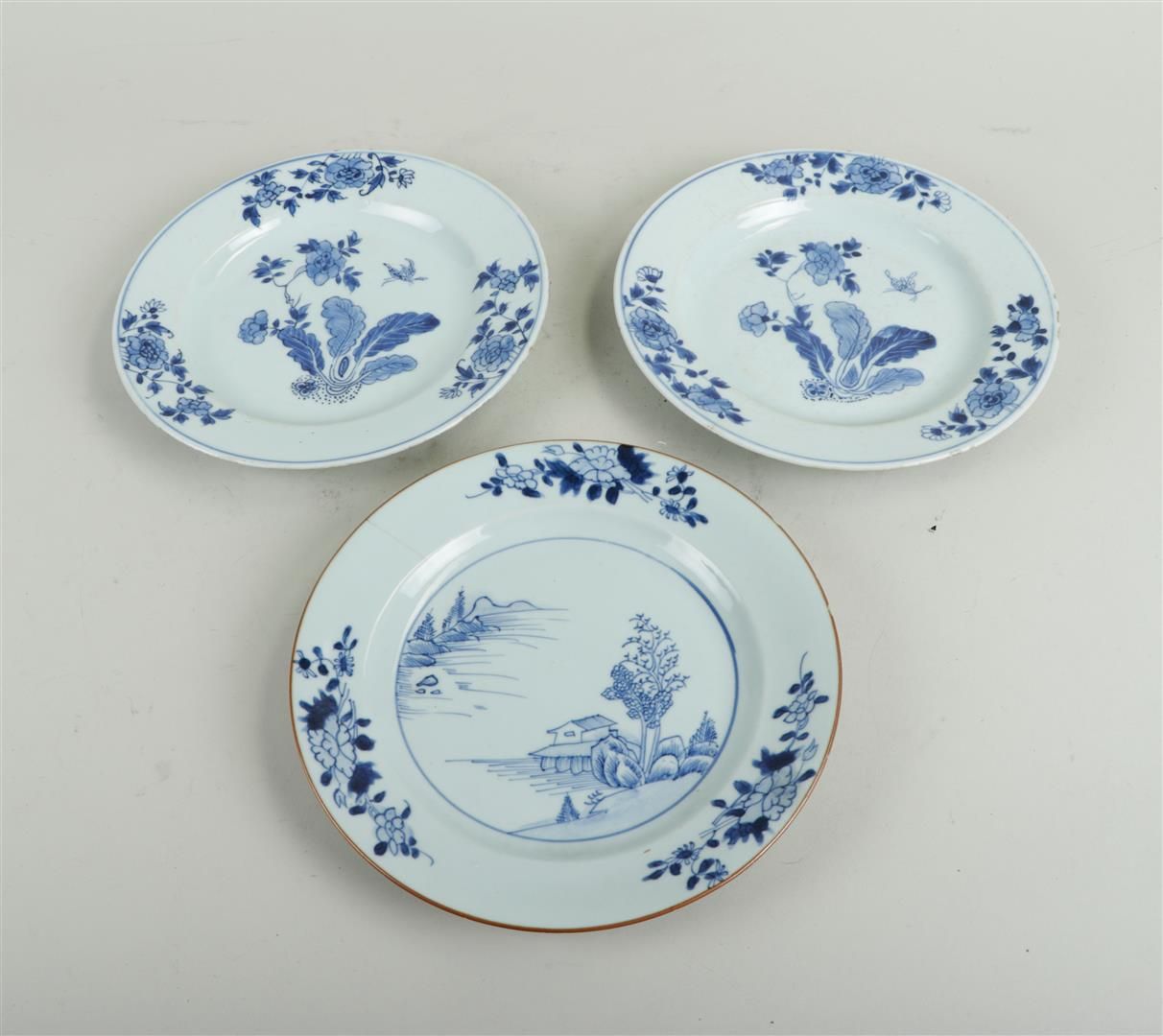 A lot of 2 plus 1 porcelain plates. China, 18th century. Edge damage and hairlines.