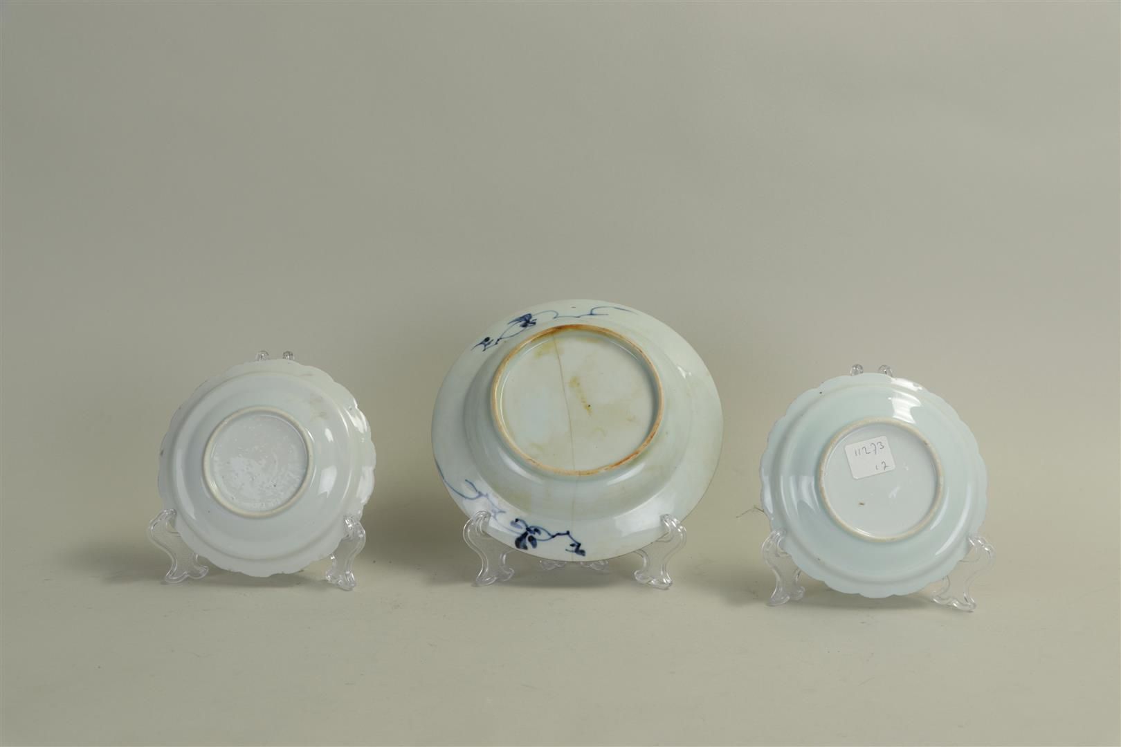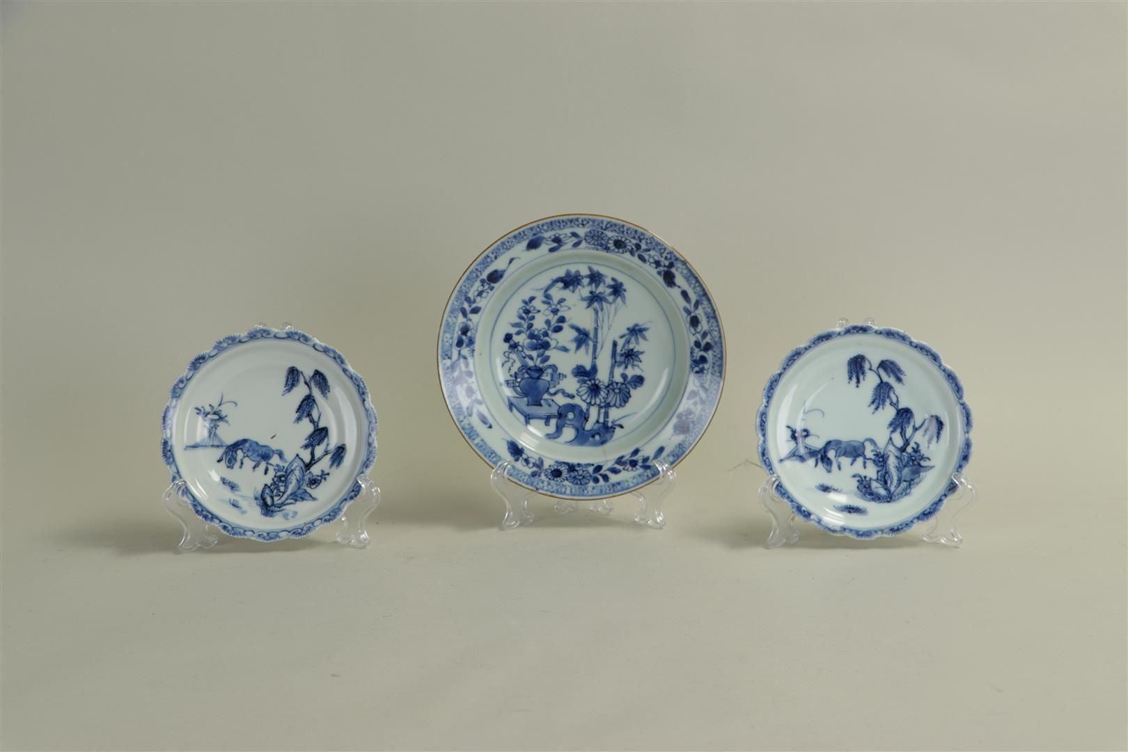 A Chinese dish, with representation of Bamboo, and antiques, China 18th century. In addition (2) plates with horse in landscape, also 18th century. Dish has hairline. First plate glued.
