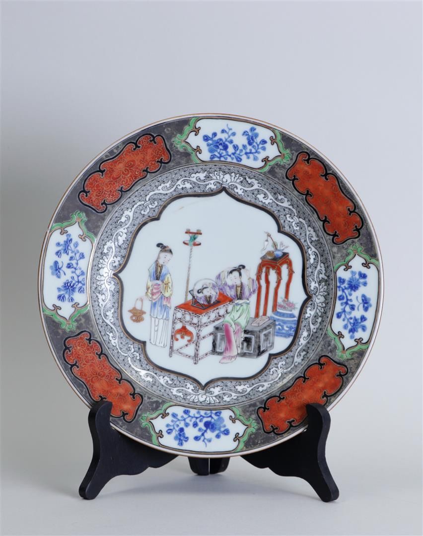 A porcelain famile noir plate with famile decoration in centre of various figures and antiques. China, 19th century. Hairline and chip.