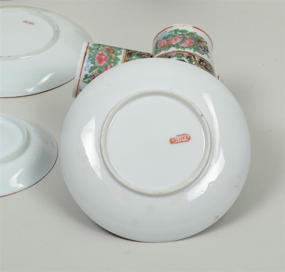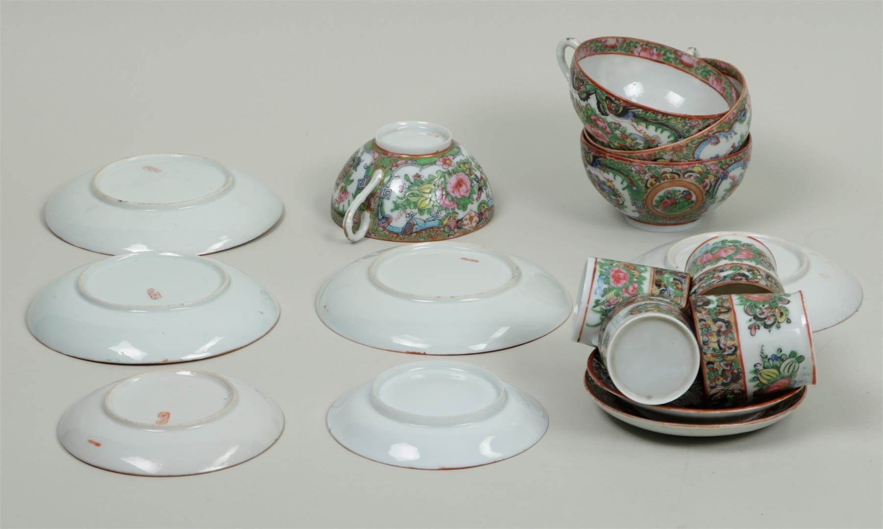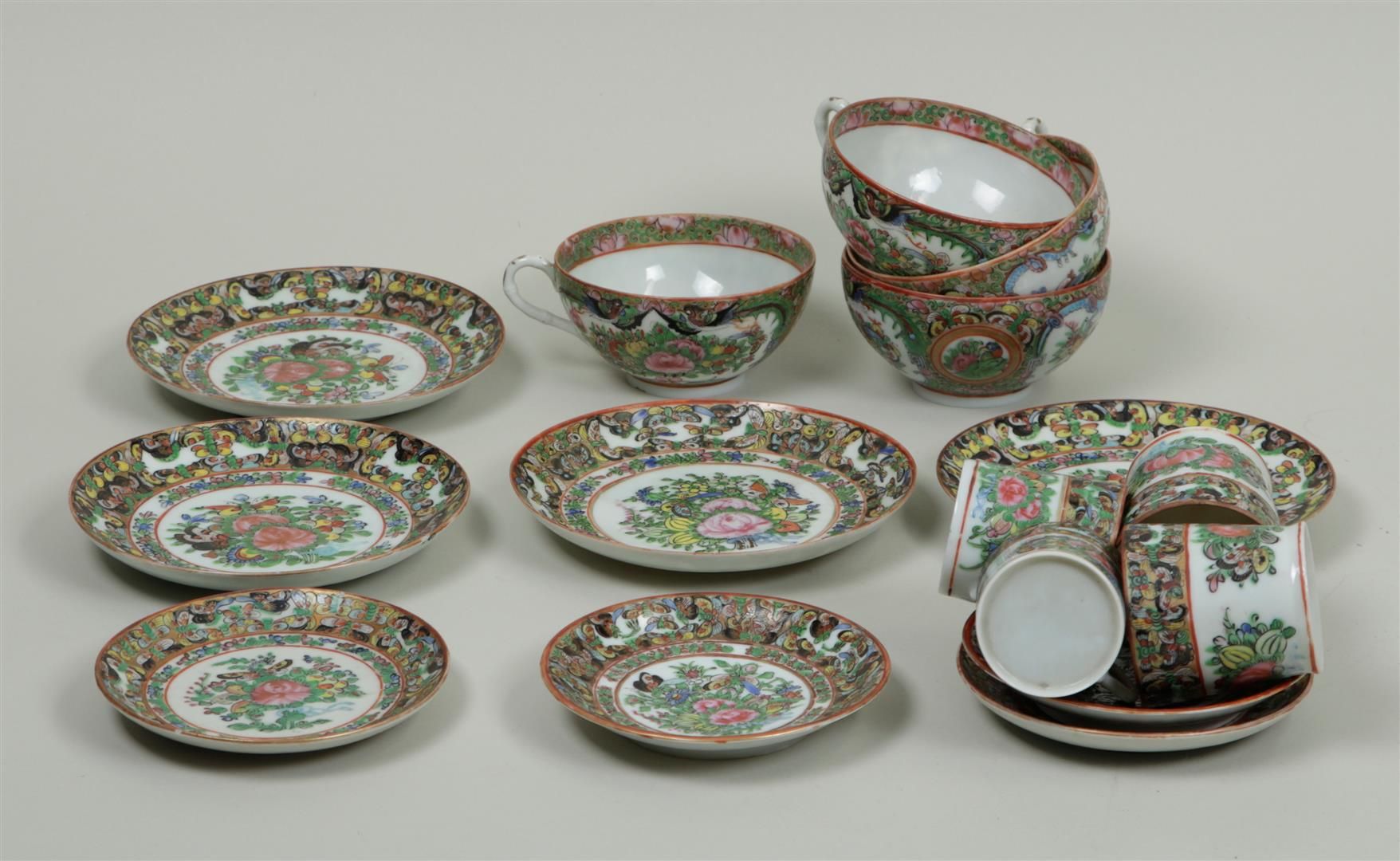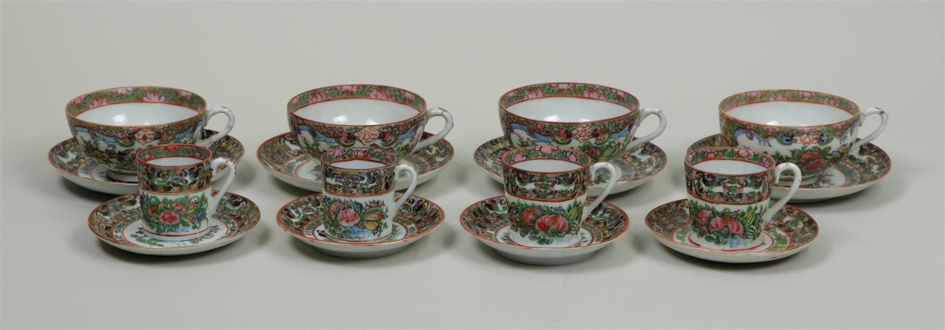A set of four porcelain tea cups and saucers and four coffee cups and saucers, in canton decor. China, 19th century.