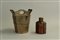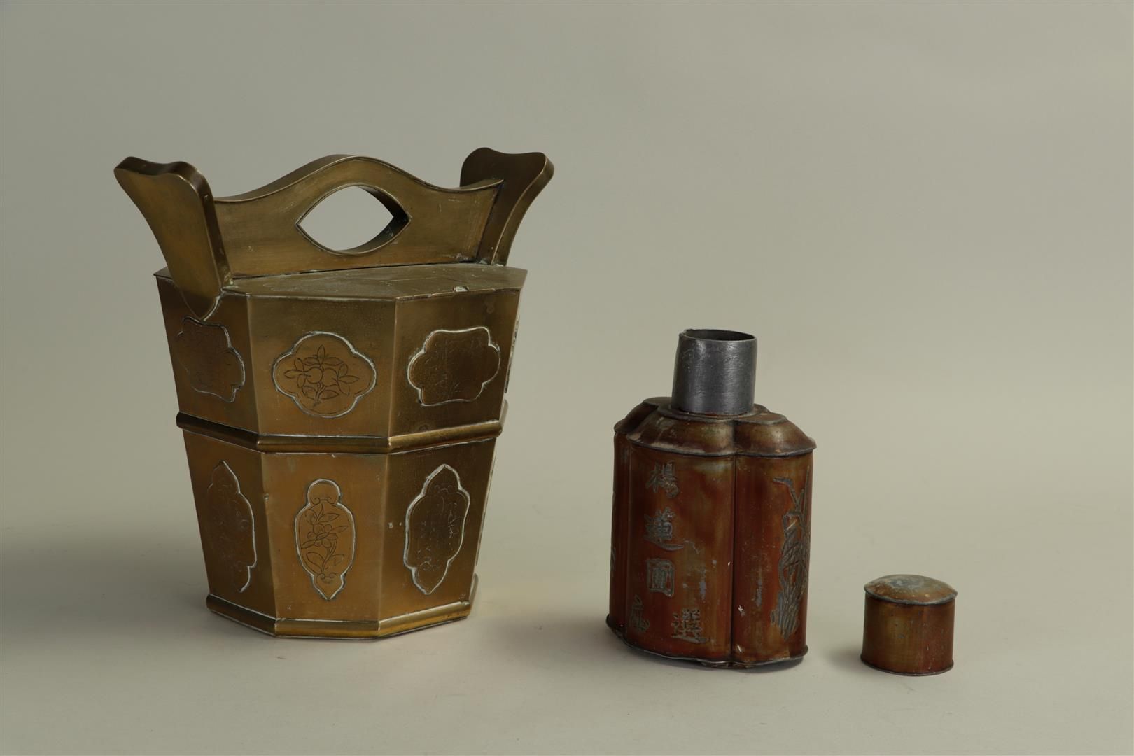 A special Chinese copper teapot with hidden filling hole and sieve, with a tea caddy, 19th century. The latter marked.