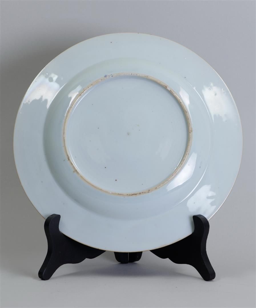 A porcelain famile rose plate decorated with peonies and encre de Chine...