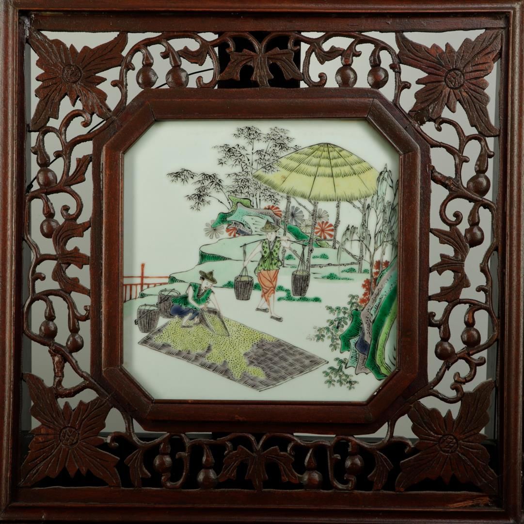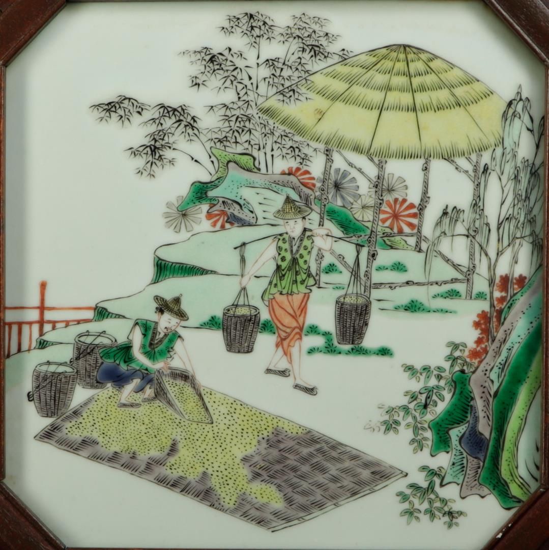 A porcelain famille vertre plaque with decoration of working figures. China, Republic.