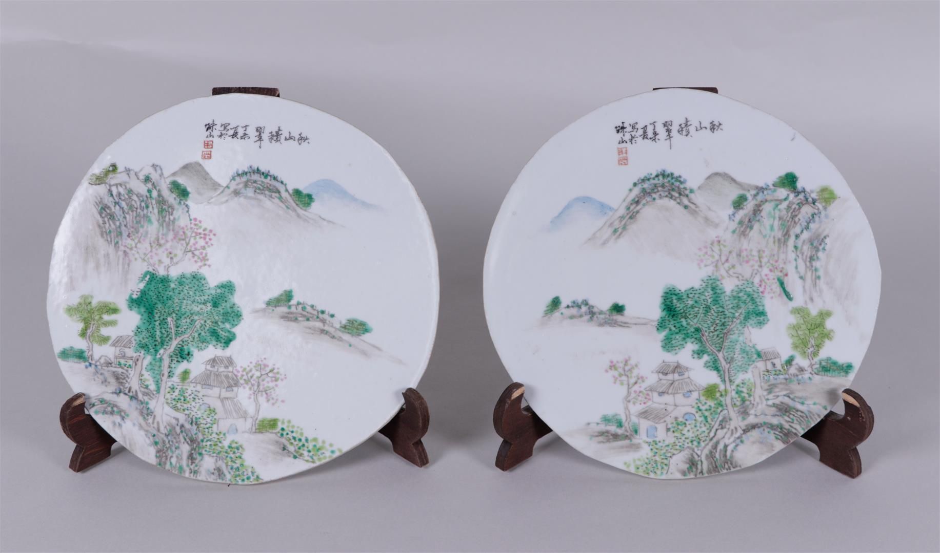 Lotto 2199 | A set of two porcelain plaques with landscape decor and Chinese texts. China,...