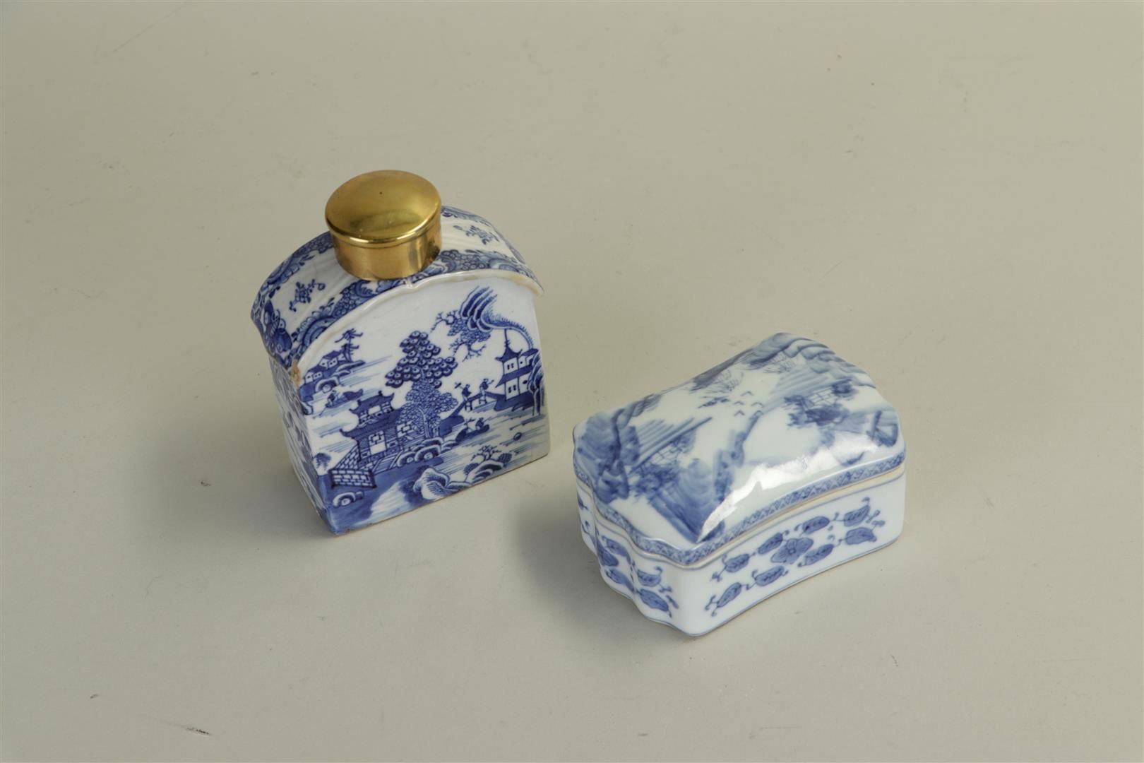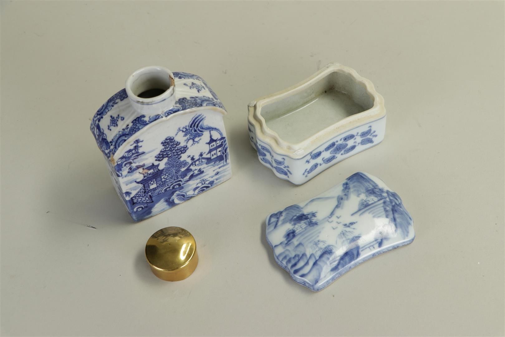 A lot consisting of a blue and white tea caddy with copper stopper, and a soap container China 18th & 20th century.