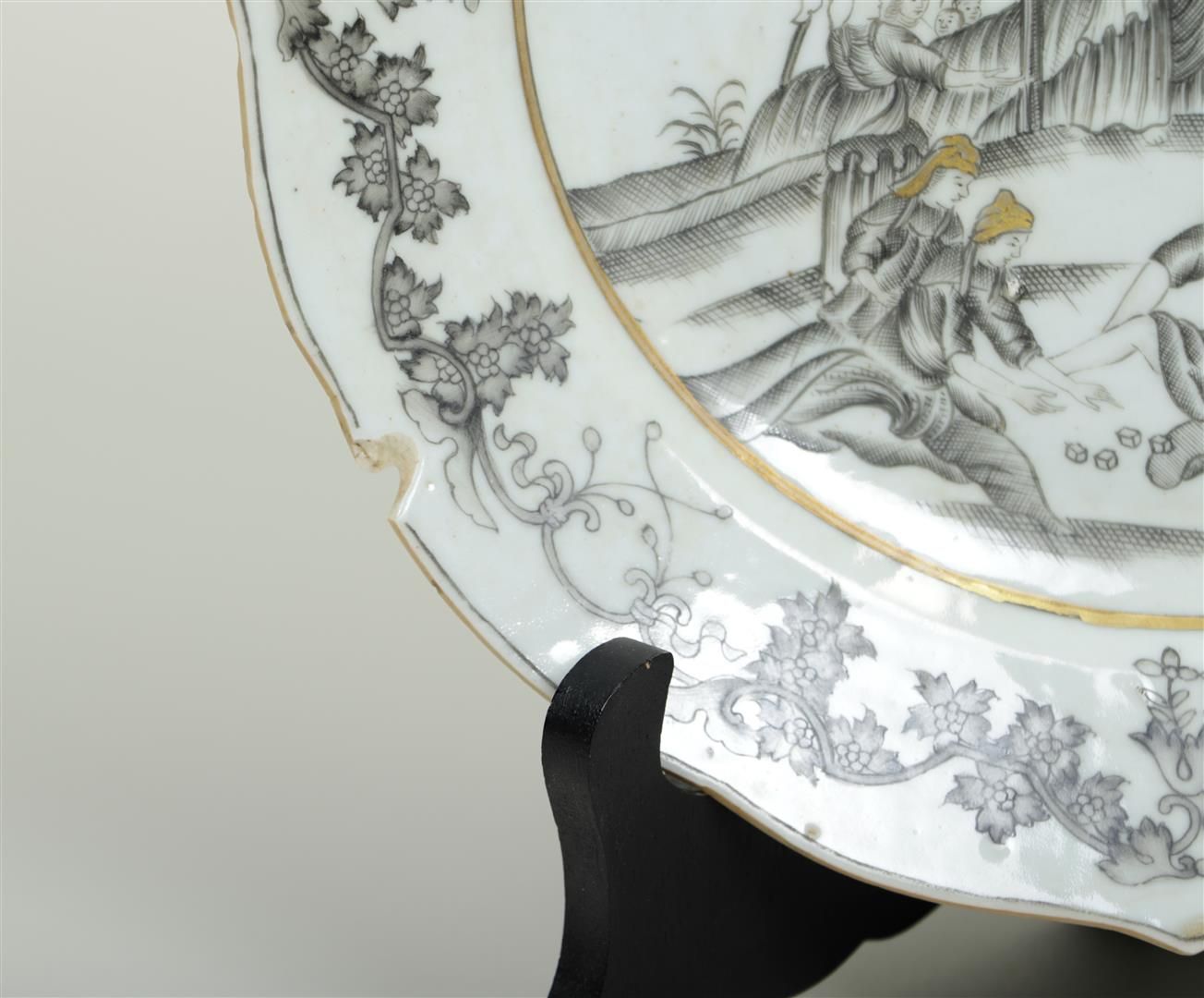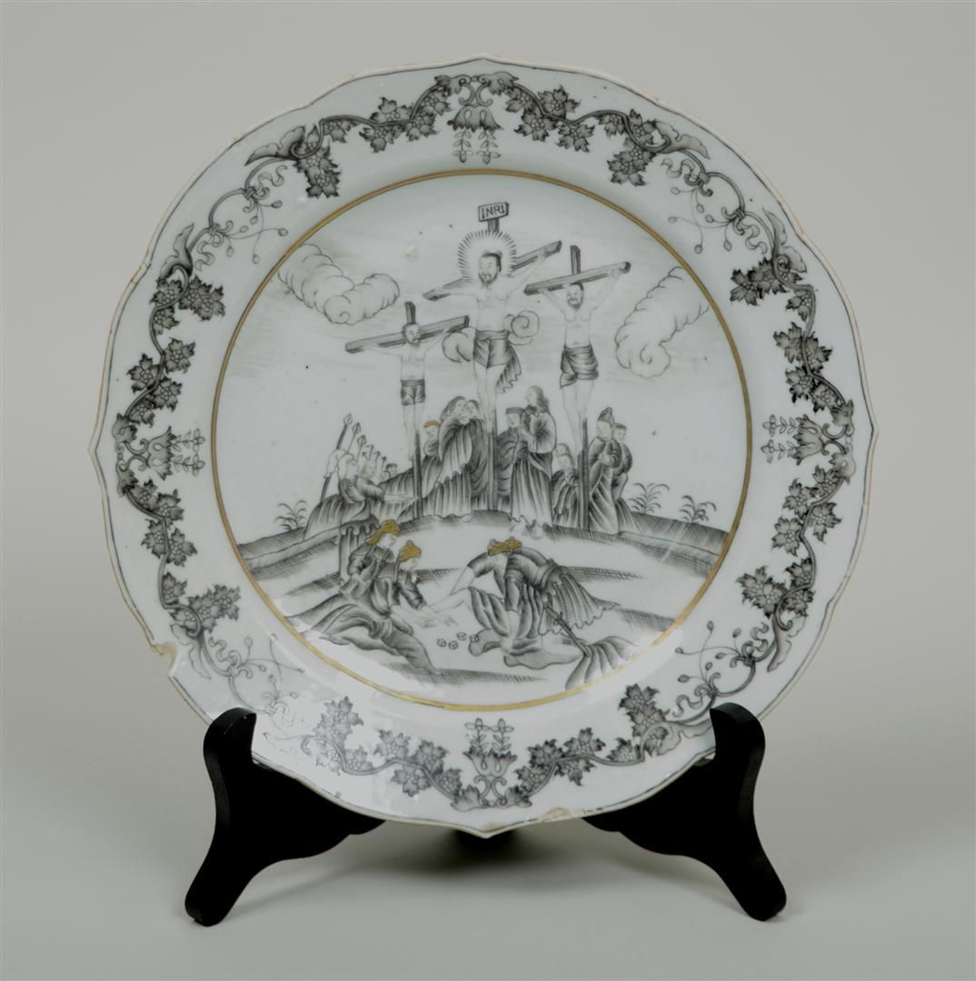 A porcelain encre de Chine plate with religious image. China, 18th century. large chip.