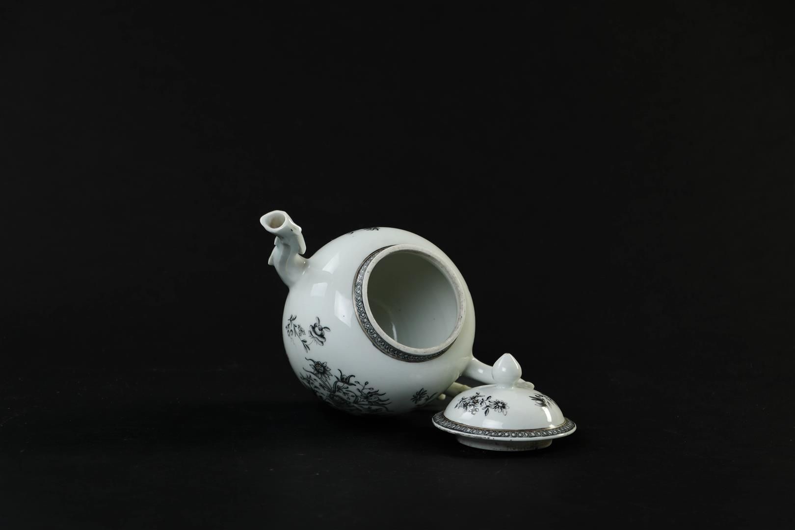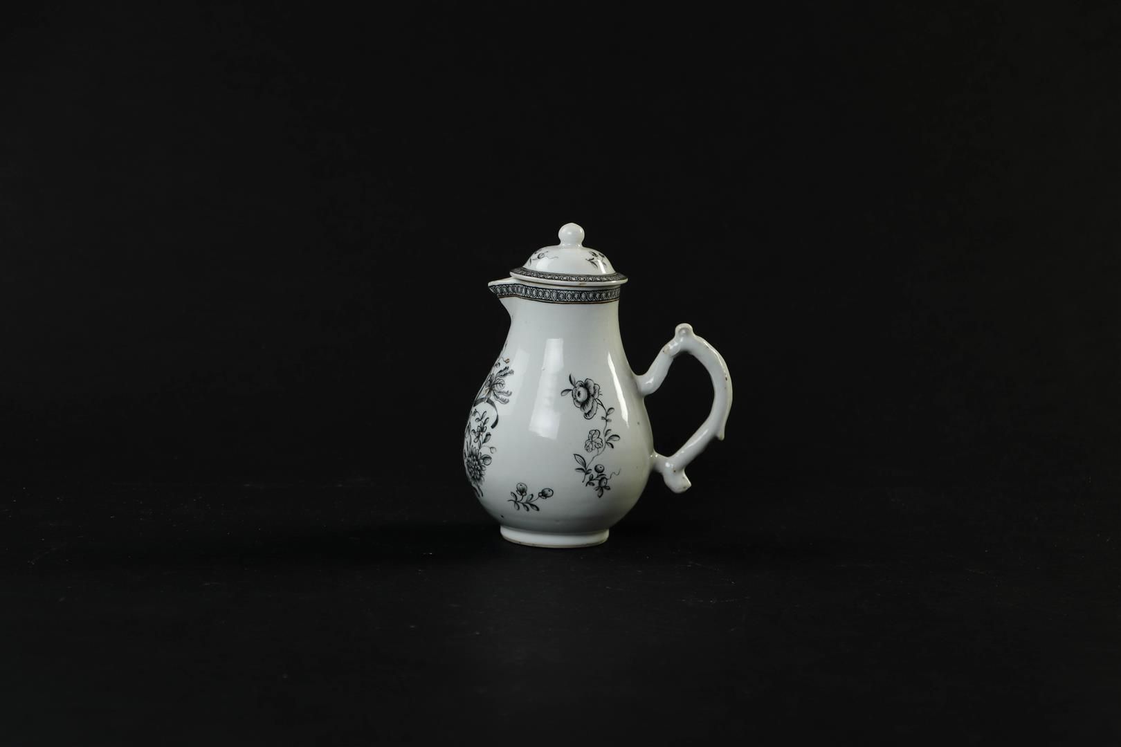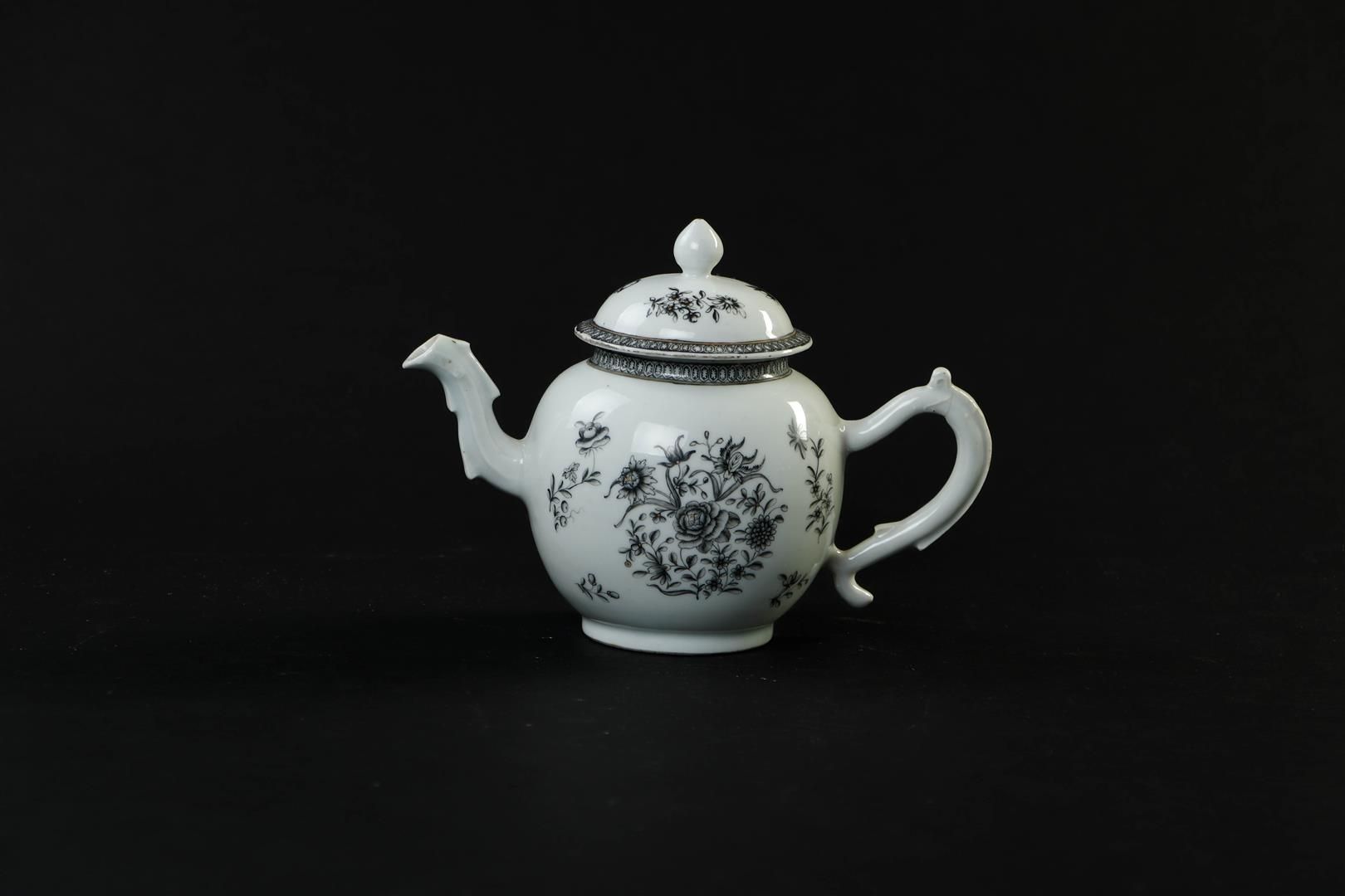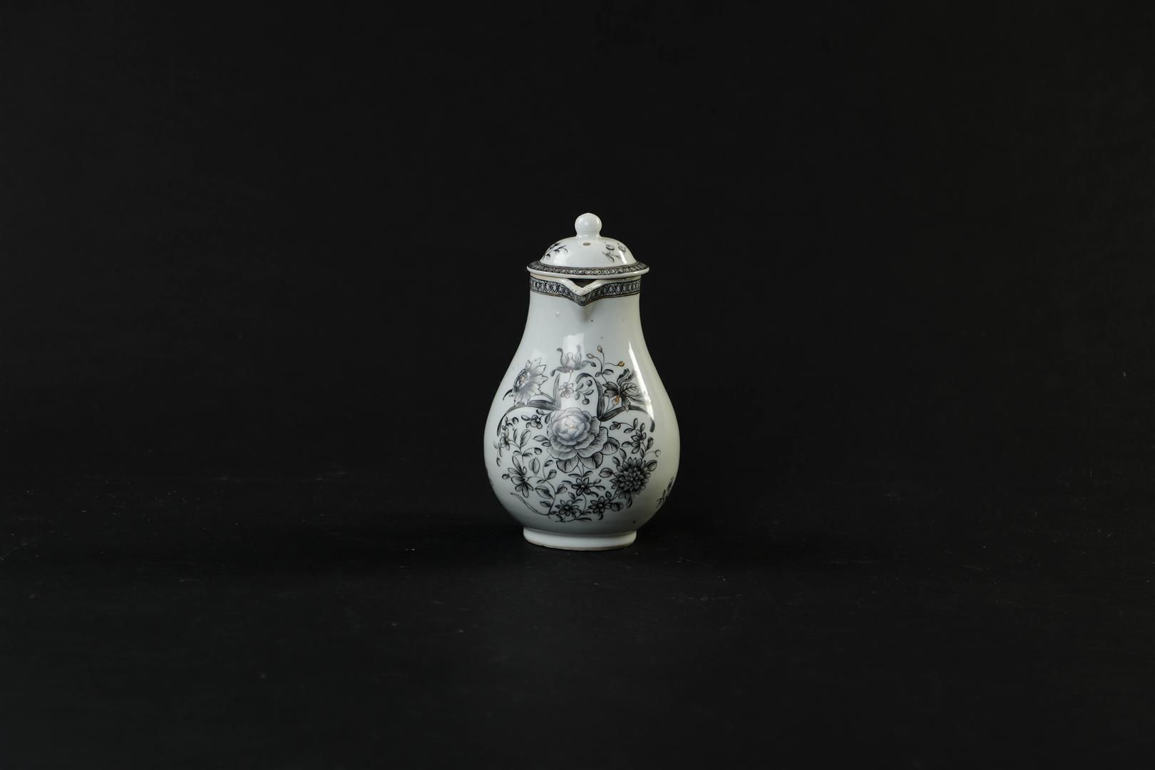 An Encre de Chine tableware set consisting of a teapot, milk jug, tea caddy, patty pan and spoon tray / patty pan. China, 18th century.