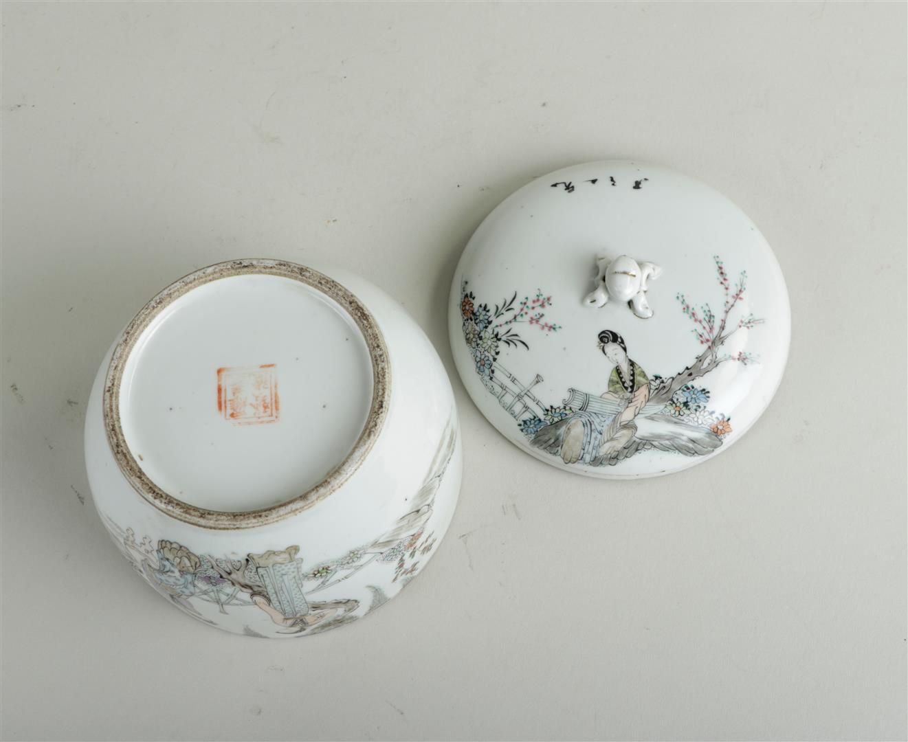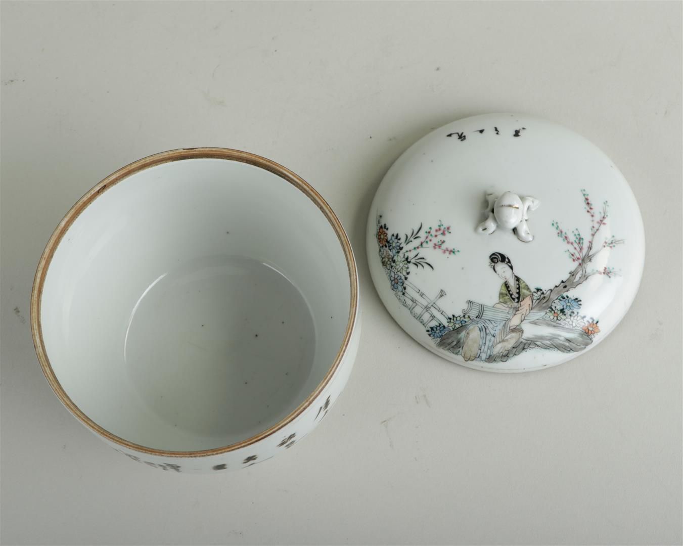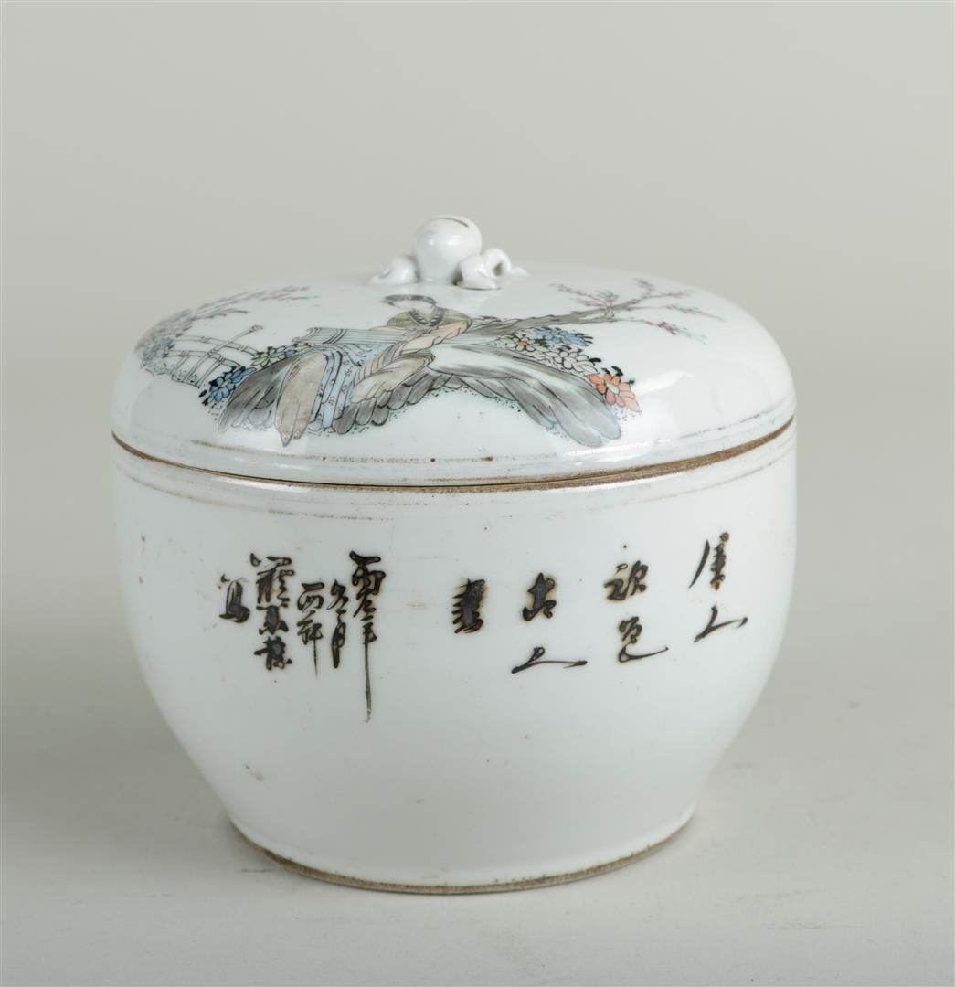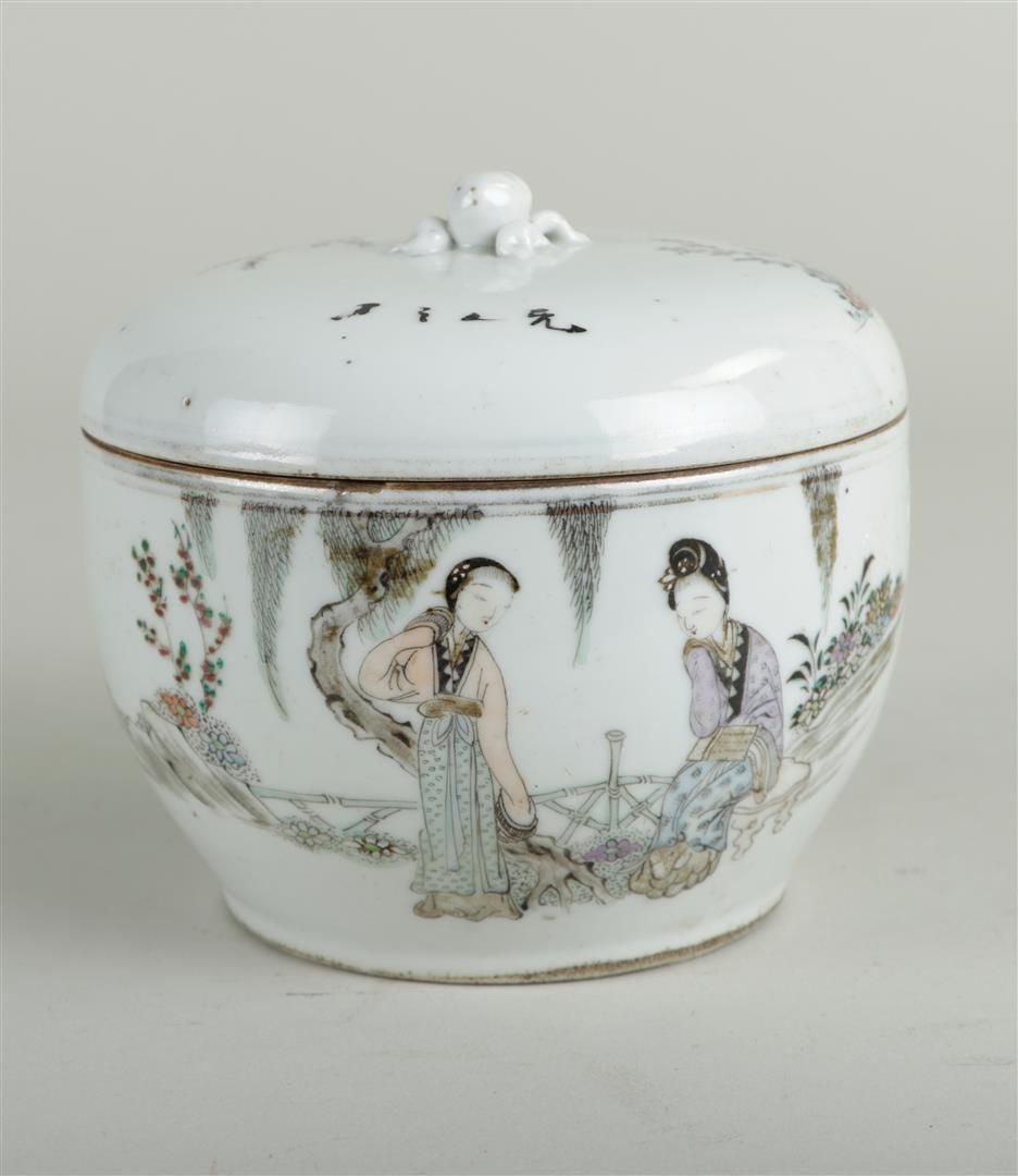 A Qianjiang porcelain covered jar decorated with various figures and text on...