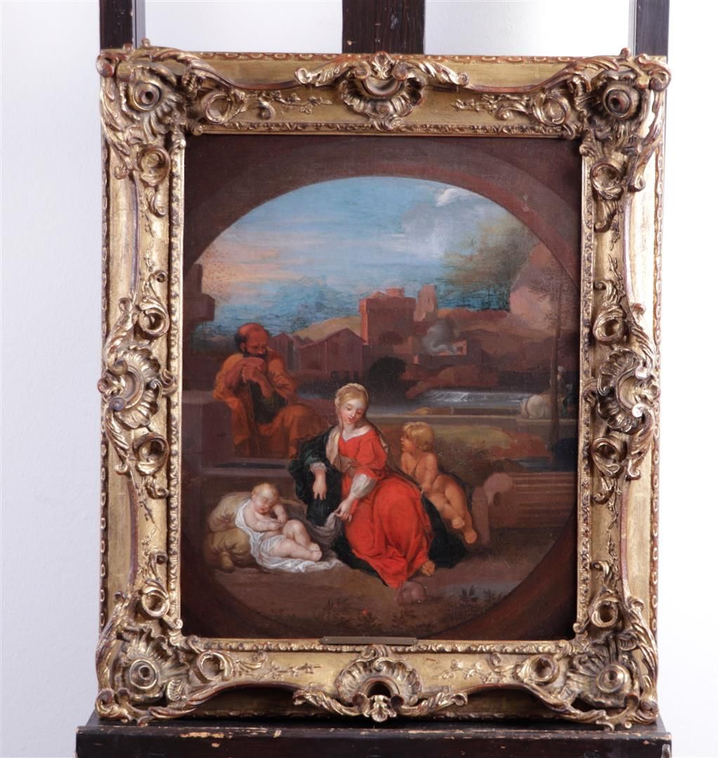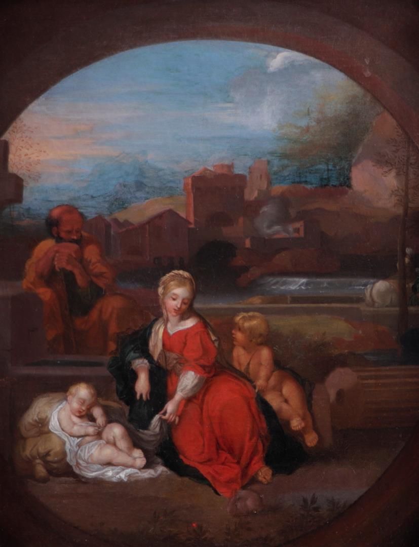 Sebeastiaan Bourdon (Montpellier 1616 - 1671 Paris), The Holy Family in an Italianate Landscape, painted in an oval. Oil on canvas.
