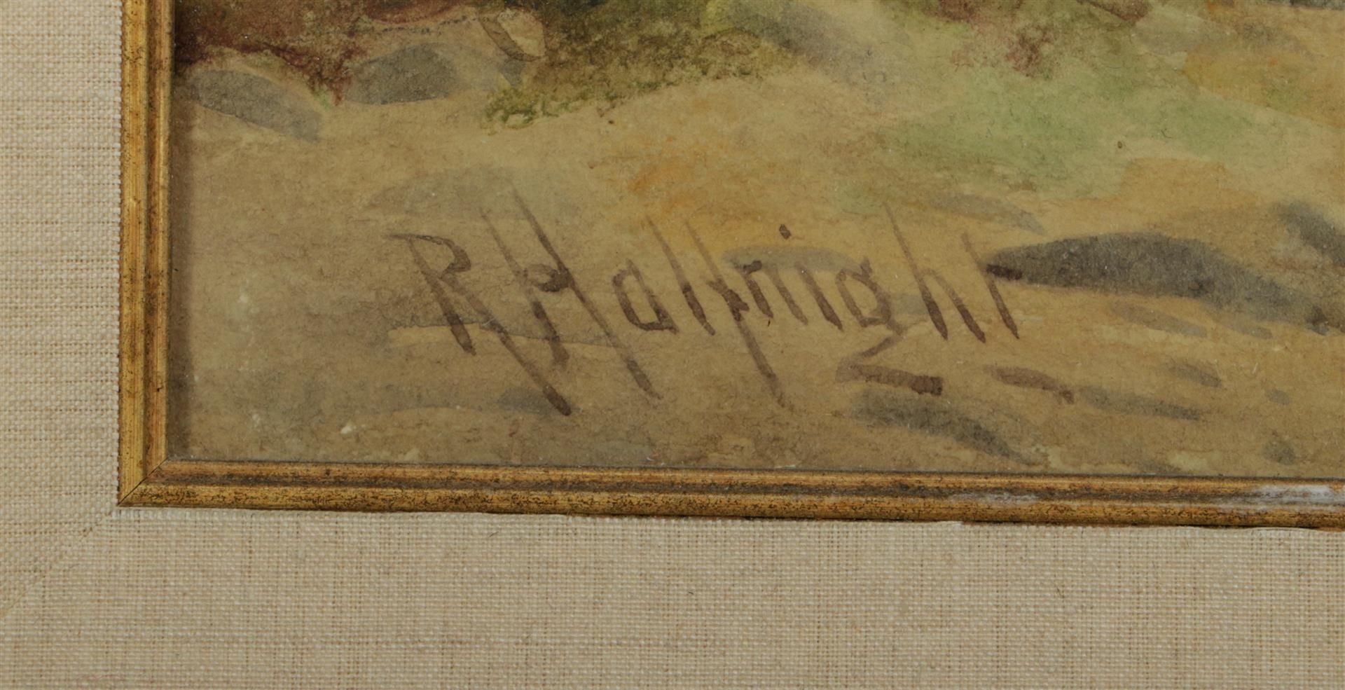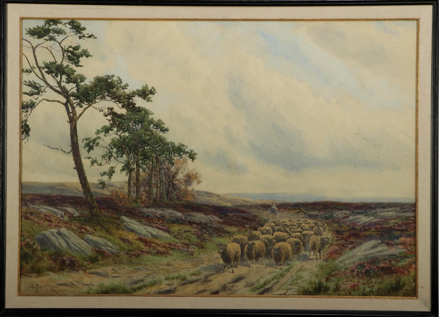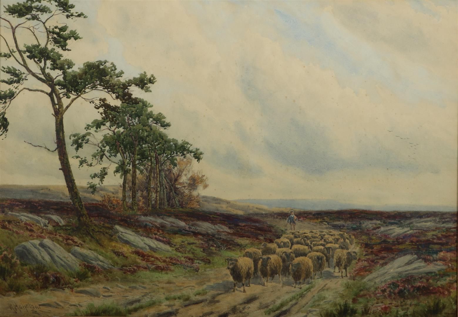 Richard William Halfnight (1855 - 1925), Heathland with shepherd and flock of sheep, signed (lower left), watercolour on paper,
