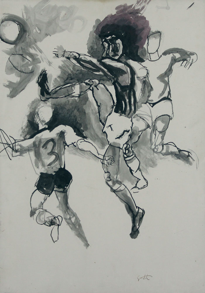 Guttuso Renato Foot Ball gouache su carta applicata su tela, cm. 70x50...