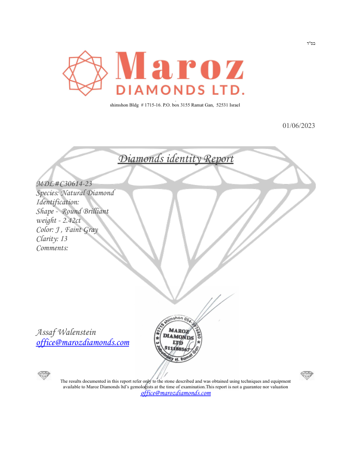 DIAMANTE 2,42 CARATI COLORE J, GRIGIO DEBOLE - PUREZZA I3 - TAGLIO BRILLANTE - CERTIFICATO GEMMOLOGICO MAROZ DIAMONDS LTD MEMBRO ISRAEL DIAMOND EXCHANGE - C30614-23