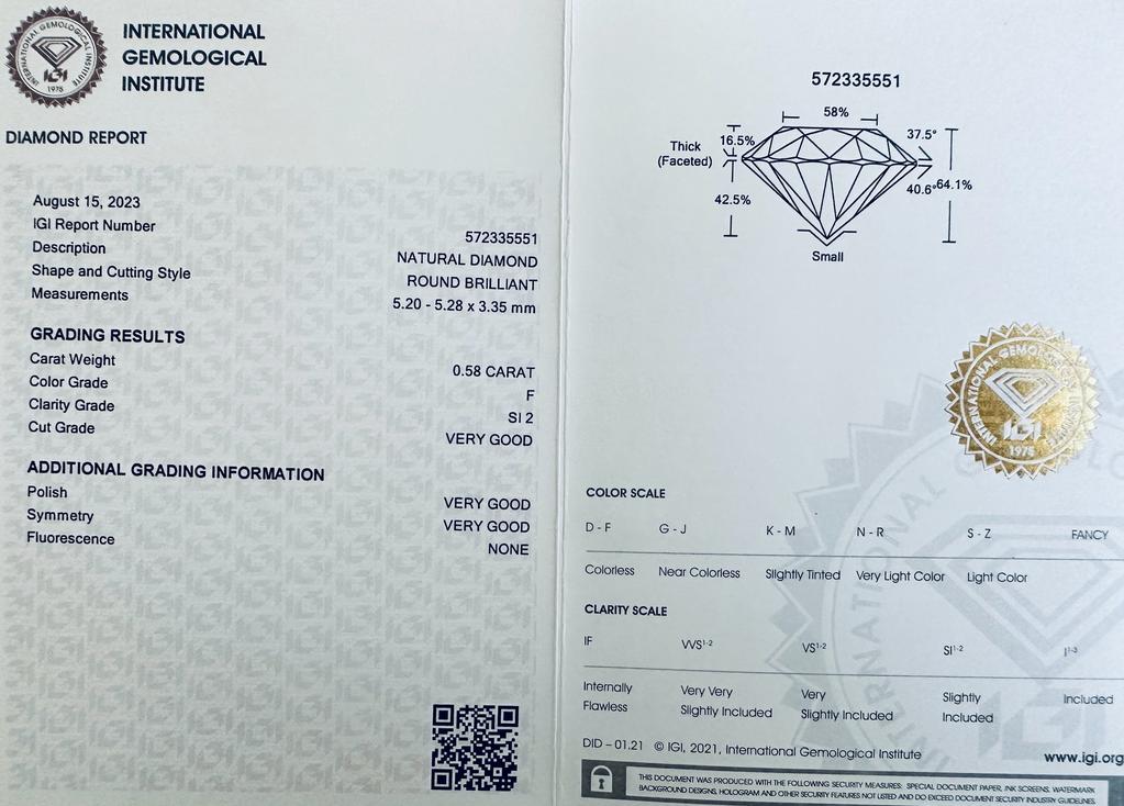 Lotto 112 | DIAMANTE 0,58 CT F - SI2 - IGI - SF30805