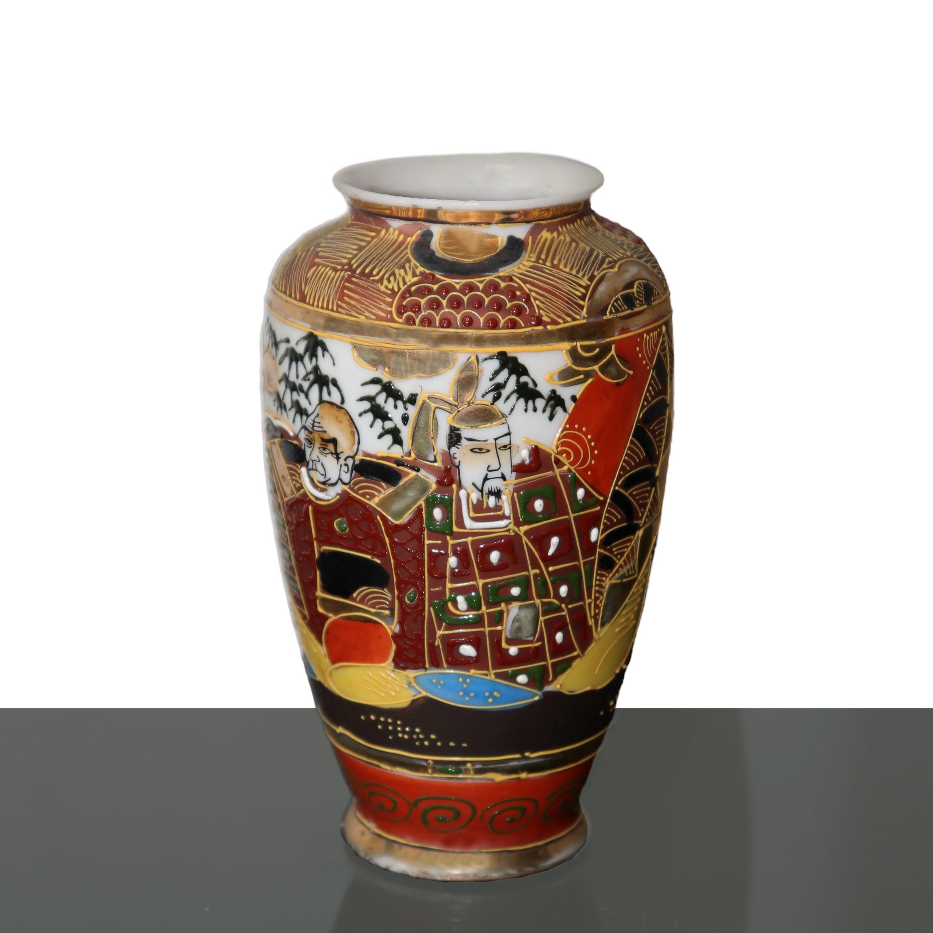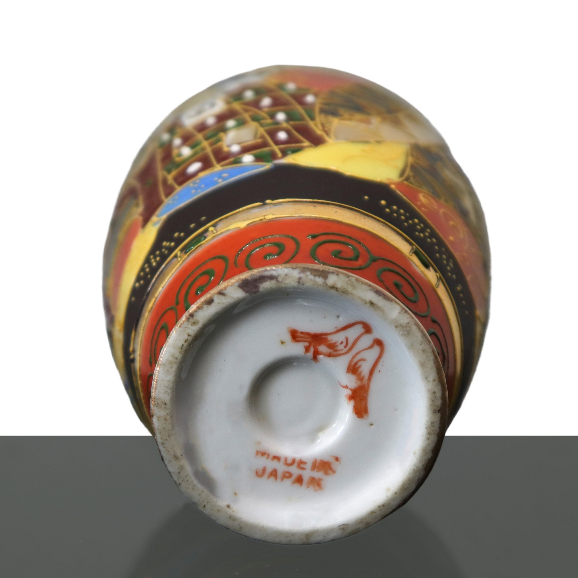Vasetto Satsuma giapponese H cm 12.8x7.8 Vaetto Satsuma giapponese decorato con personaggi dagli abiti e dalle acconciature giapponesi. Decori dorati, rossi. Scritta "MADE IN JAPAN" e timbro con due uccelli alla base.Vaetto Satsuma giapponese decorato con personaggi dagli abiti e dalle acconciature giapponesi. Decori dorati, rossi. Scritta "MADE IN JAPAN" e timbro con due uccelli alla base.