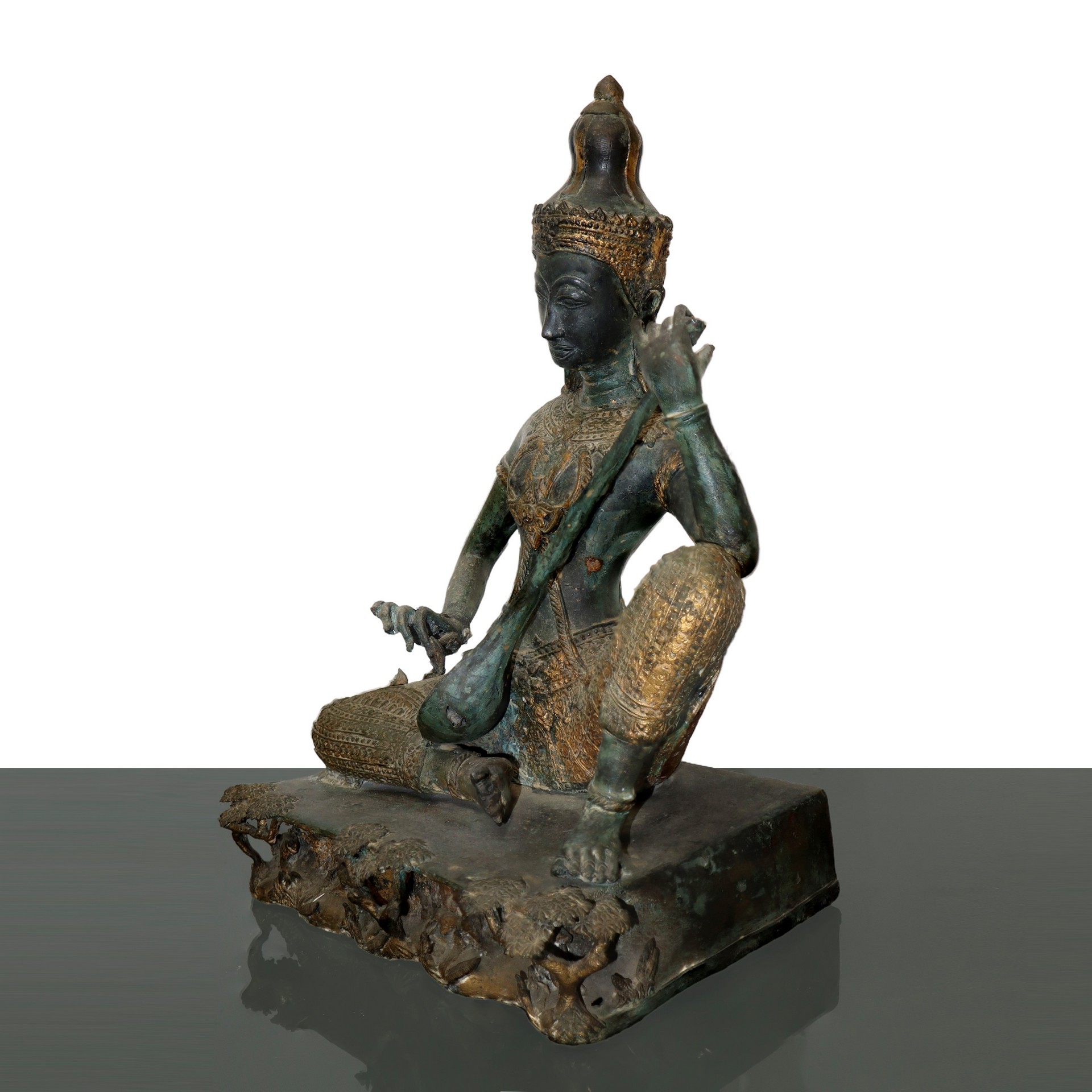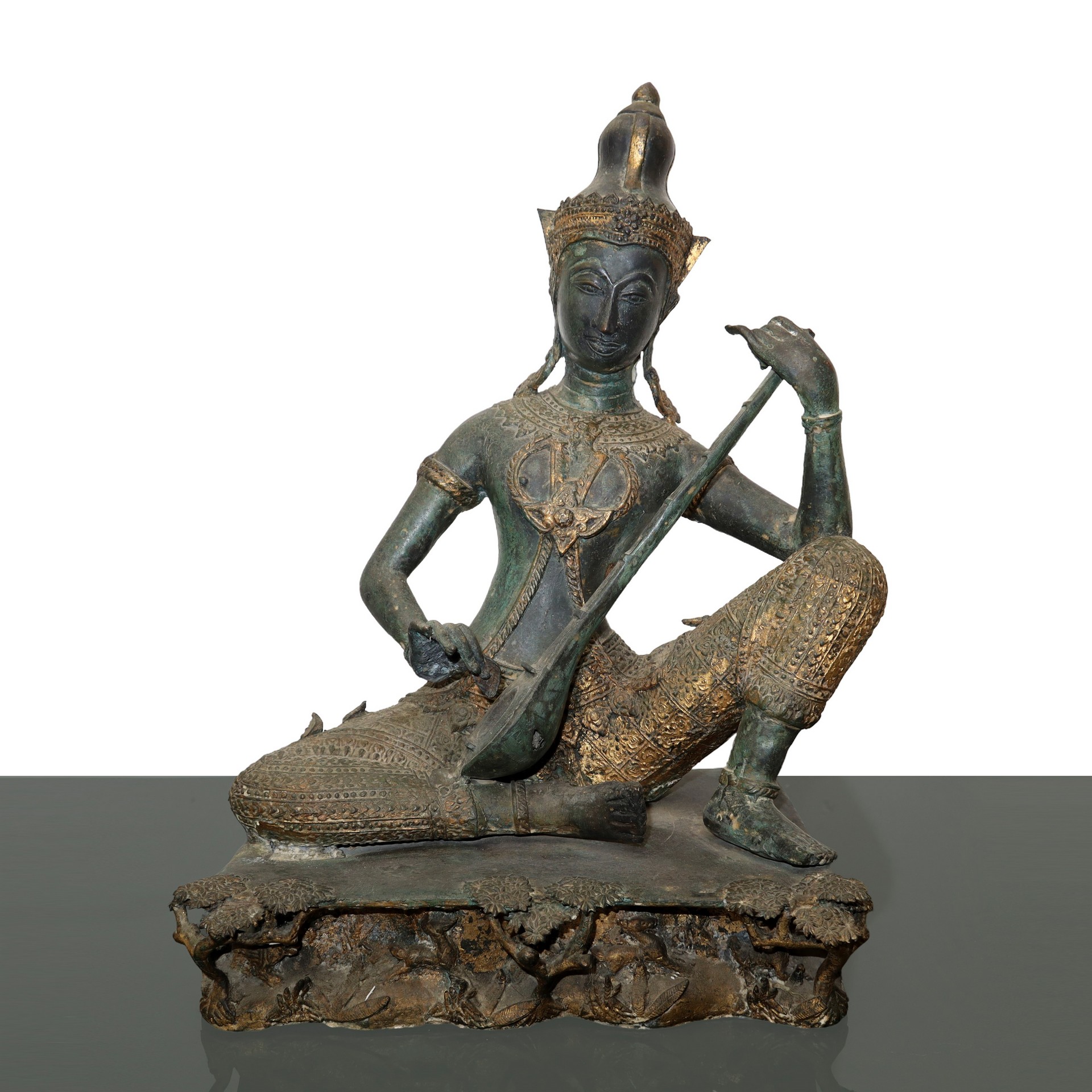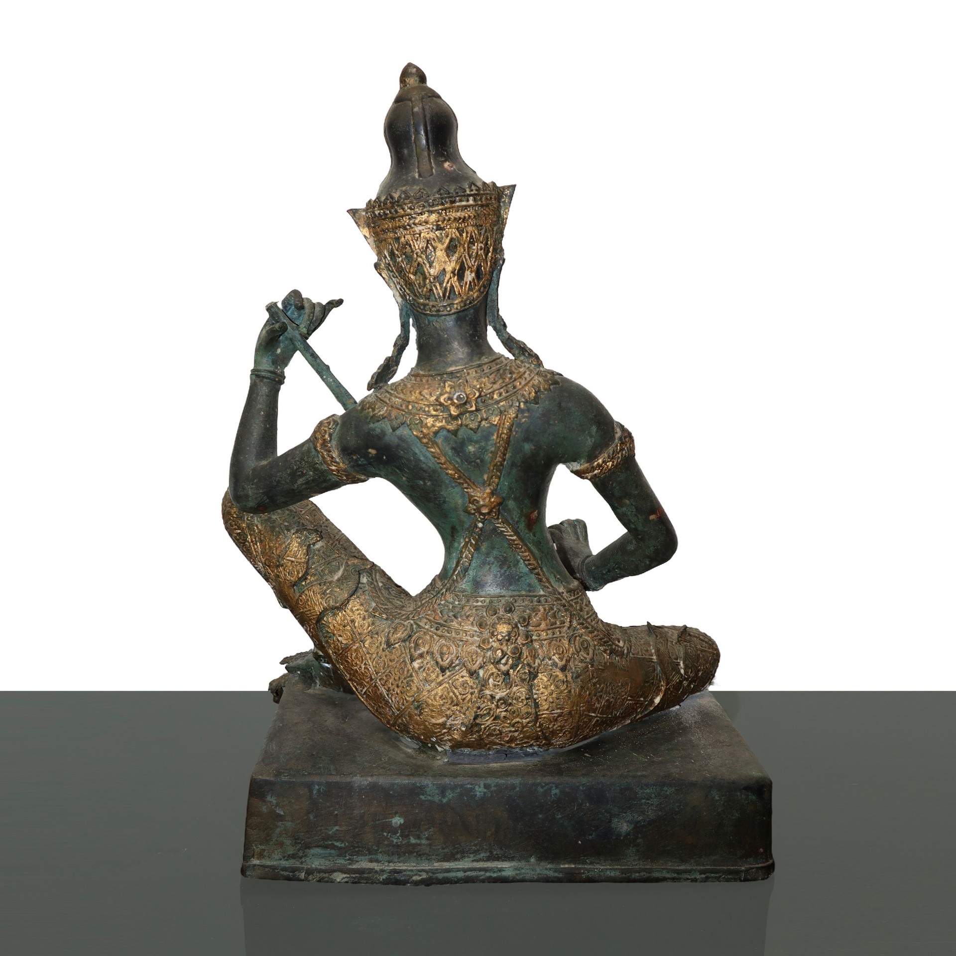 Statua in bronzo raffigurante il Principe thailandese Phra Aphai Mani H cm 39.2 x 39.5 Scultura thailandese in bronzo del principe musicante Phra Aphai Mani. L'uomo sta suonando uno strumento a corda tradizionale asiatico chiamato "Zueng". La parte superiore dello strumento è mancante. Scultura thailandese in bronzo del principe musicante Phra Aphai Mani. L'uomo sta suonando uno strumento a corda tradizionale asiatico chiamato "Zueng". La parte superiore dello strumento è mancante.