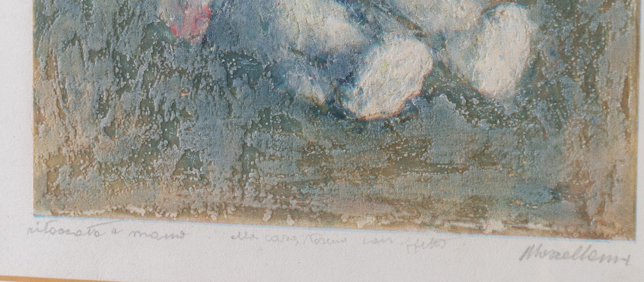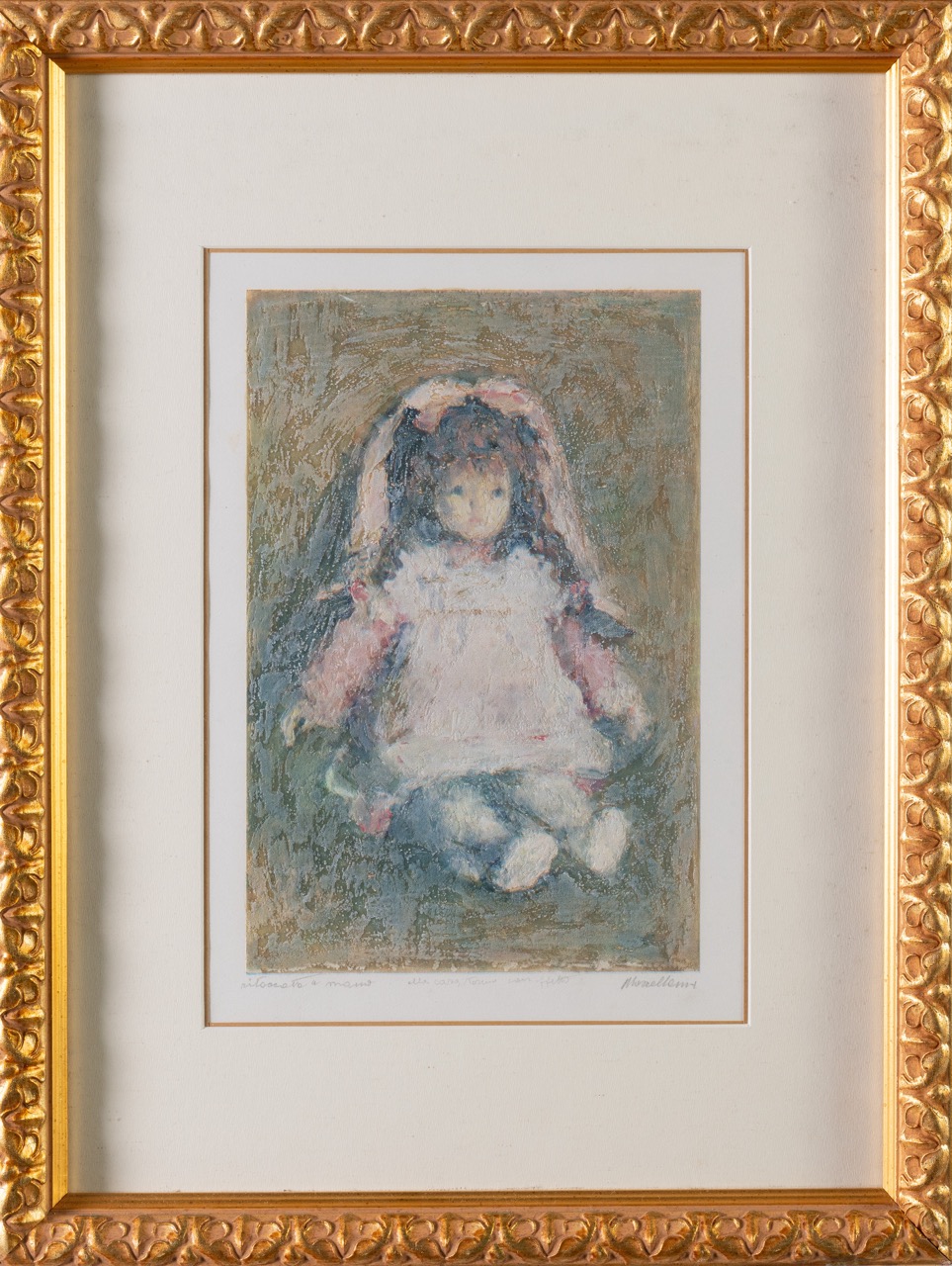 Norma Mascellani ( Bologna 1909- 2009). Bambola. Litografia ritoccata a mano. Firmata in basso a sinistra Mascellani. In basso al centro presente dedica. Al verso etichetta Galleria Marescalchi, Bologna. Cm.30x20. In cornice cm 55x42.