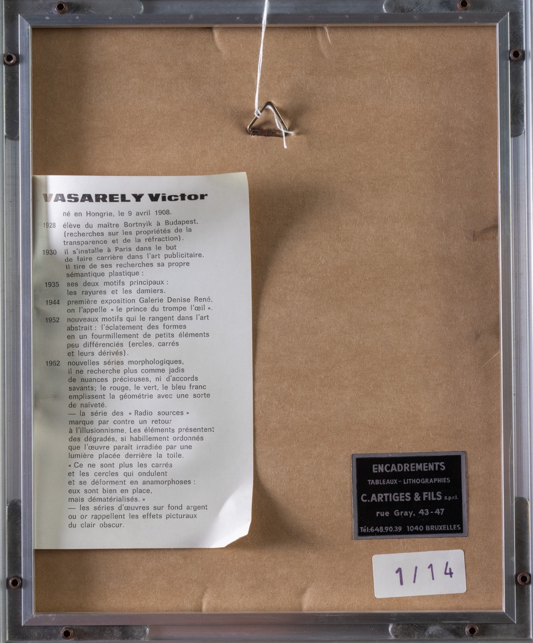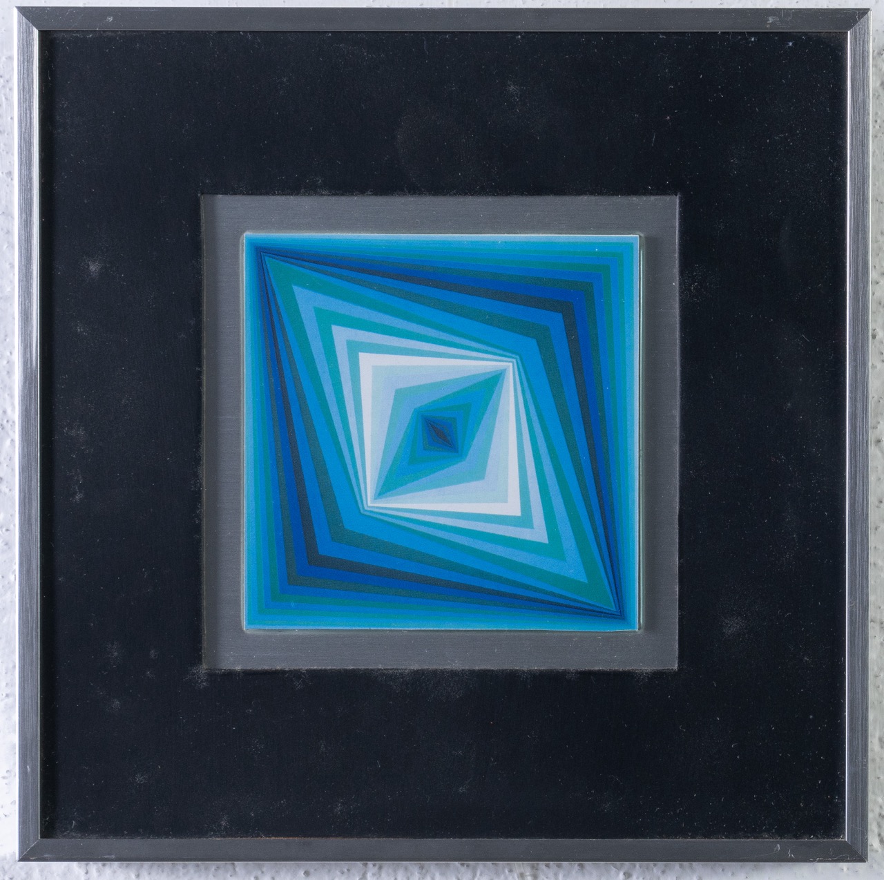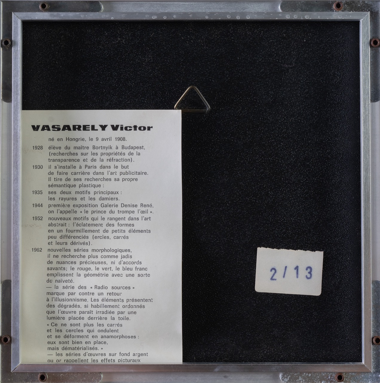 Victor Vasarely ( Pécs 1906 - Paris 1997). Lotto di 5 stampe offset su supporto metallico. Al verso recano etichett Encadrements, Artiges & Fils, Bruxelles. Con cornice e vetro. Cm. da 10x10 a 14,5x9,5. In cornice cm. da 22x22 a 26x21,5.