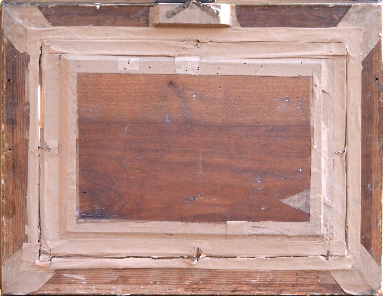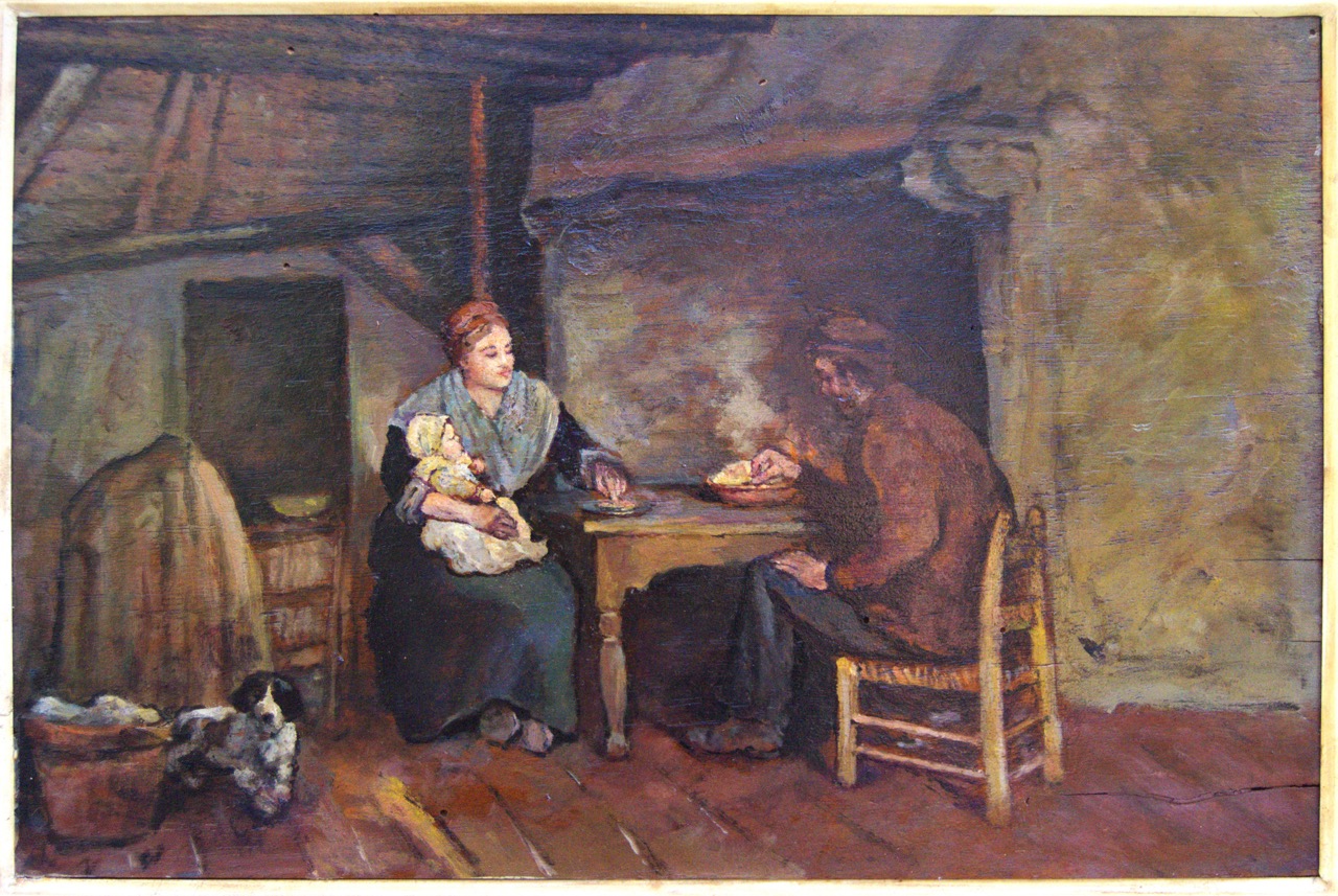 Pittore degli inizi del XX secolo. Scena d'interno con personaggi. Olio su compensato. Con cornice. Cm. 24x35.
