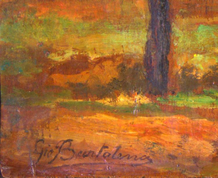 Giovanni Bartolena (Livorno, 1866 - 1942). Paesaggio con due pini marittimi. Olio su compensato. Firmato in basso a sinistra Gio Bartolena. Cm. 18,5 x 15,5.