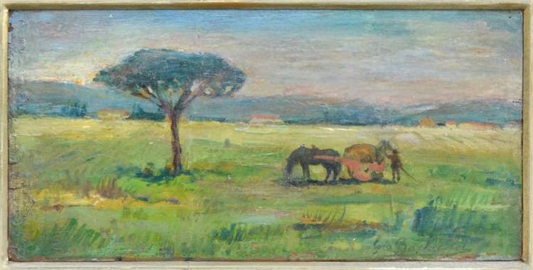 Giovanni Bartolena (Livorno, 1866 - 1942). Paesaggio maremmano con personaggio e pino. Olio su cartone. Firmato in basso a sinistra Gio Bartolena. Cm. 14.4x29,5.