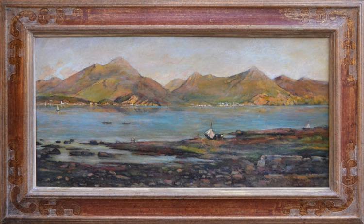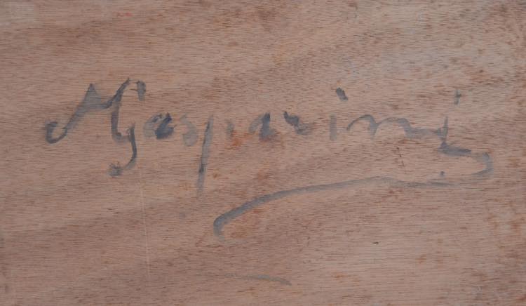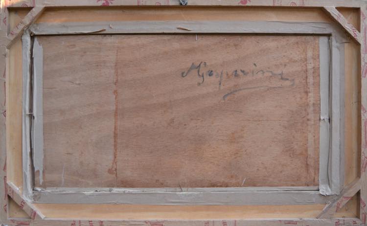 Pittore della prima metà del XX secolo. Paesaggio lacustre. Olio su compensato. Al verso firmato M. Gasparini. Con cornice. Cm. 42x79.