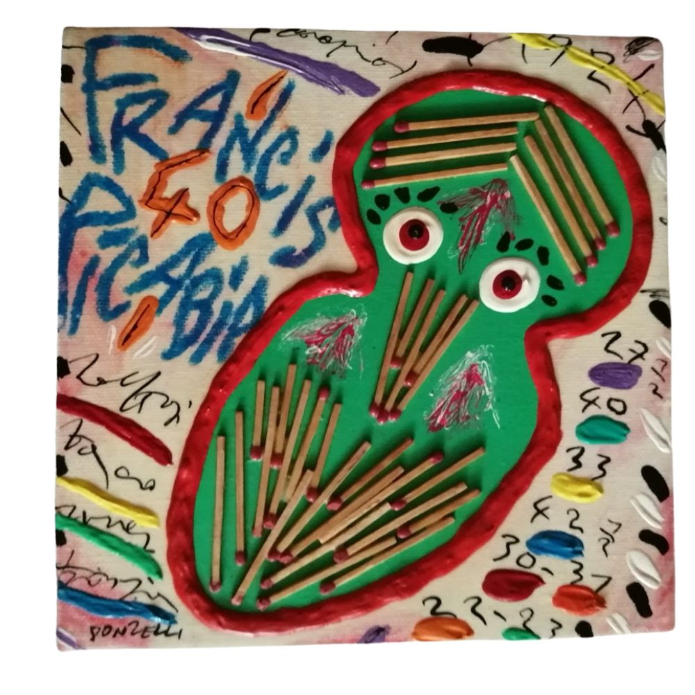 Bruno Donzelli ( Napoli 1941). Ormare, Francis Picabia. Tecnica mista su tela. Firmata in basso a sinistra Donzelli. Al verso firmato e titolato Bruno Donzelli Ormare Francis Picabia. Autentica fotografica firmata dall'artista. Cm 20x20.