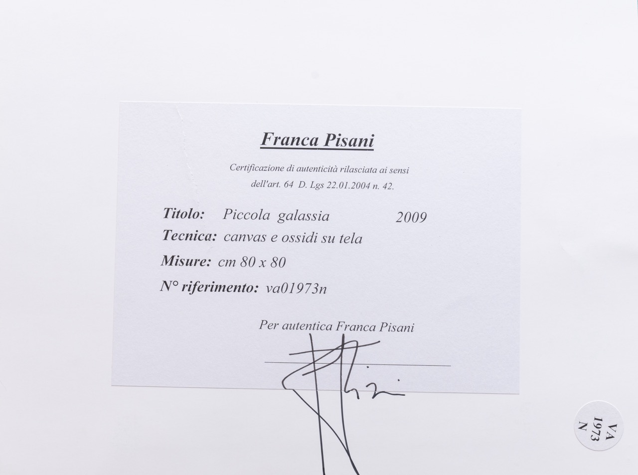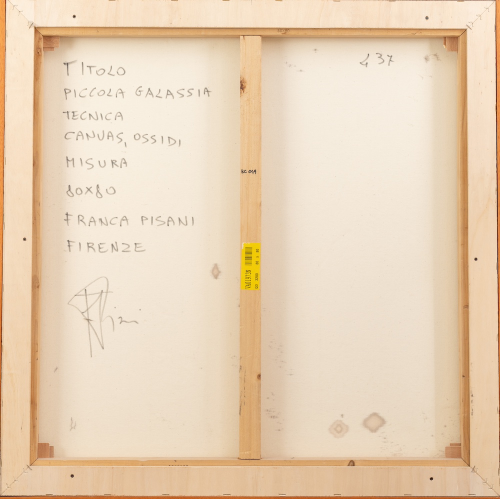 Franca Pisani (Grosseto 1956). Piccola galassia, 2009. Canvas e ossidi su tela. Titolato, datato, firmato, tecnica, misure e luogo al verso. Autentica su fotografia a firma dell'artista. Cm 80x80.