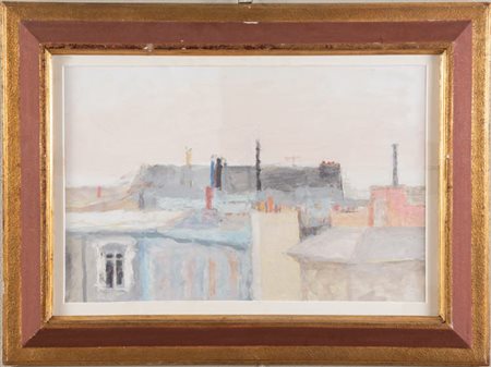 Giuseppe Gagliardi (Bologna 1902 - 2005). Tetti di Bologna. Olio su tela. Al verso cartiglio. Cm 40x60.