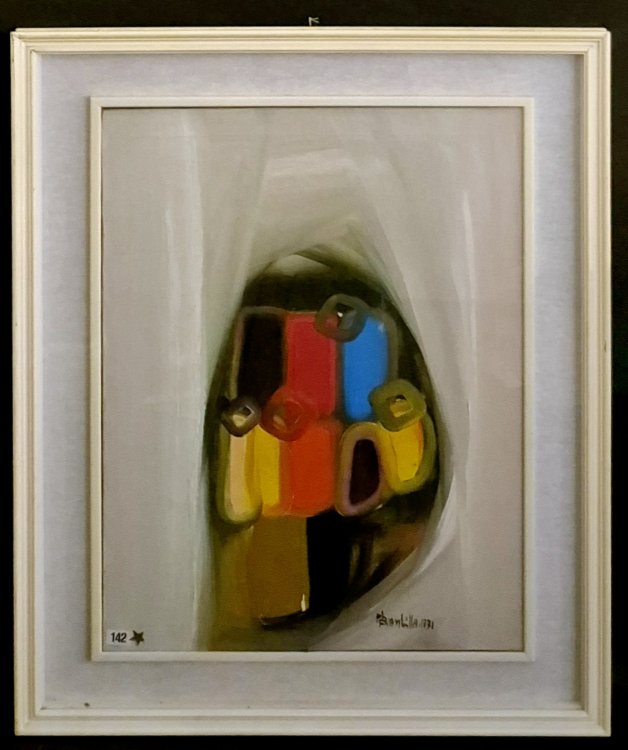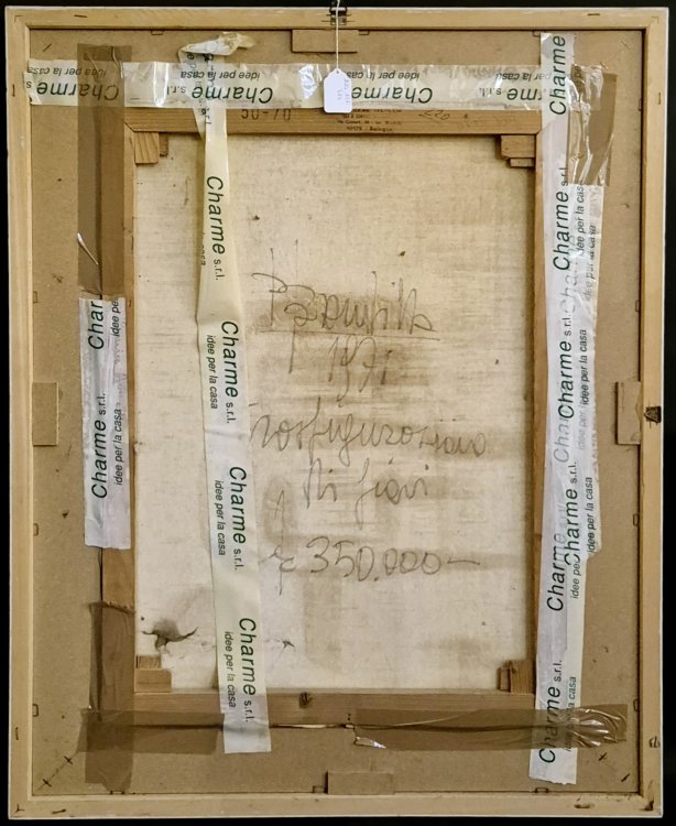 Paolo Brambilla (Bologna 1936). Trasfigurazione di fiori, 1971. Olio su tela. Firmato e datato in basso a destra P Brambilla 1971. Al verso titolato, datato e firmato. Al verso numeri. In cornice con vetro. Cm 69,5x50. In cornice cm 89,5x69,5.