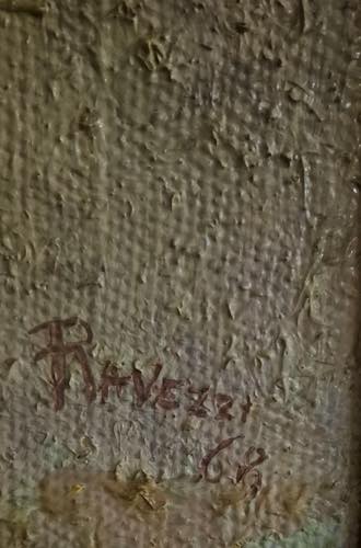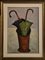 Pittore della seconda metò del XX secolo. Ombrelli, 1968. Tempera su cartone. Firmato e datato in basso a destra Ravezzi 68. Cm. 74x48. In cornice cm. 93,5x67,5.