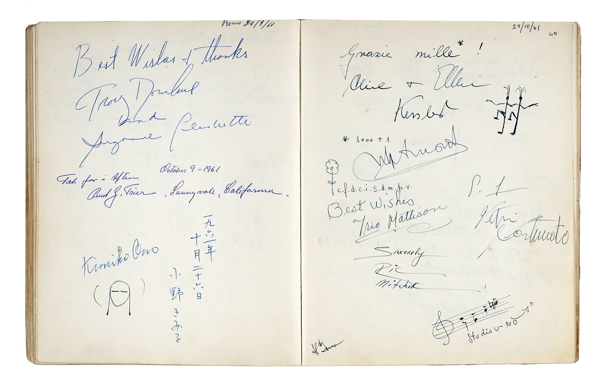 Album di firme e dediche, con disegni, schizzi, ricordi, fotografie, biglietti, ritagli di giornale ecc. Oltre 130 pagg. compilate. Legatura cartonata con protezione esterna mancante. Dimensioni 190x240 mm. (1) Il ristorante Mastro Stefano di Piazza Navona, tra gli anni '50 e '90 è stato un punto di ritrovo del bel mondo internazionale, frequentato da noti personaggi, principi, artisti, attori, registi, scrittori, pittori, sportivi e politici. Nell'album si ritrovano una tempera del danese Vincent Lerche, un cavallo stilizzato di Aligi Sassu, due disegni dello spagnolo José Ortega, un viso di Menghini, uno di Lea Healing, uno di Alberto Sughi, una botticella romana schizzata da Holger Worm, un disegno di Rafael Alberti, una foto con dedica della ballerina Maya Plisetskaya, una dedica con simpatico schizzo delle gemelle Kessler, una dedica con disegnato un fiore di Joan Baez, una citazione musicale di Perez Prado, una poesia in romanesco con disegno di Enrico Montesano, dediche di Beppe Grillo, Don Lurio, del cantante Charles Brown, di Irene Papas, ecc. Sono inoltre presenti le firme di Alida Valli, Alberto Lupo, Ingrid di Danimarca, Delia Scala, Gorni Kramer, Garinei e Giovannini, Giulietta Masina, Anna Magnani, Walter Chiari, Valentina Cortese, Lelio Luttazzi, Giovanna Ralli, Giorgio Albertazzi, Vittorio Gassman, Vittorio De Sica, Jane Mansfield, Ben Gazzara, Franco Cerri, il quartetto Cetra, Dino Risi, Ann Margret, Philippe Leroy, Michel Piccoli, Tina Aumont, Charles Bronson, Lee J. Cobb, Rod Steiger, Paul Anka, l'Equipe 84, Ruggero Orlando, Luciano Salce, Carlo Mazzarella, Peppino e Luigi de Filippo, Ornella Vanoni, Jean Paul Belmondo, Enrico Montesano, Giorgio de Chirico, Renato Guttuso, Junio Valerio Borghese, Leonardo Sinisgalli, Sando Pertini, Alfonso Gatto, Ignazio Silone, Indro Montanelli con la moglie Colette Rosselli, ecc. Nel 1982 appose la sua firma, con una nota, anche il grande campione Muhammad Ali.