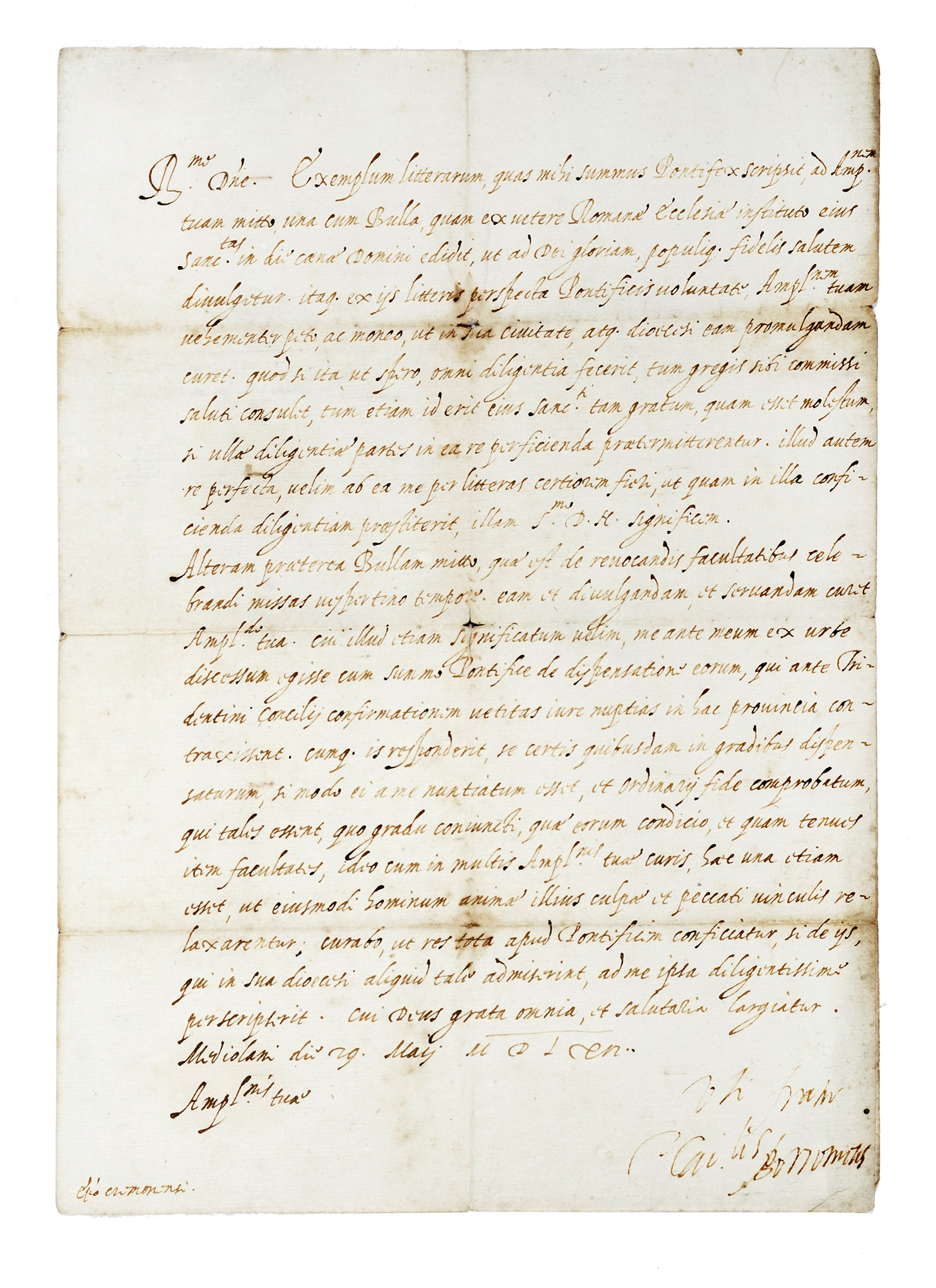 Manoscritto a inchiostro bruno. 1 bifolio, scritta 1 pagina. Testo in latino. Al verso il nome del destinatario, alcune note di altra mano, traccia di sigillo in ceralacca e alcune tracce di carta gommata grigia. Piegature della carta. Dimensioni: 310x215 mm. (1) Incipit: Exemplum litterarum quas mihi summus Pontifex scripsit [...] tuam mitto una Bulla quam ex vetere Roma a Ecclesia instituto eius Sanc.tas in di.o cana Domini editit, ut Dei gloriam populiq. Fidelis salutem divulgitur [...]. La lettera è scritta da Milano.