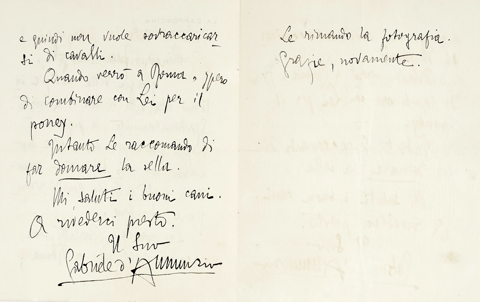Manoscritto autografo a penna nera. 1 bifolio (3 pagine scritte). Carta con intestazione La Capponcina / Settignano di Desiderio / Firenze. Carta con filigrana. Dimensioni 175x220 mm. (1) L'indirizzo (Settignano di Desiderio), che d'Annunzio fa stampare sulla carta intestata della Capponcina, contiene un curioso doppio senso: se da un lato ricorda lo scultore rinascimentale Desiderio da Settignano, dall'altro con la locuzione di Desiderio allude alle ardenti passioni amorose del Vate. Questa lettera è inviata all'amico Francescangeli, probabilmente un allevatore di cavalli romano. La marchesa Carlotti citata nel testo è la nobildonna Alessandra di Rudinì, vedova del marchese Carlotti e amante di d'Annunzio tra il 1903 e il 1906, che il Vate soprannominò Nike, il miracolo biondo. Mio caro Francescangeli, grazie delle notizie intorno alla villa di Tor di Quinto. Sfortunatamente la pigione è troppo grave per me [...] La marchesa Carlotti non caccerà quest'anno a Roma; e quindi non vuole sovraccaricarsi di cavalli. Quando verrò a Roma, spero di combinare col lei per il poney. Intanto le raccomando di domare la sella. Mi saluti i buoni cani [...] Il suo Gabriele d'Annunzio.