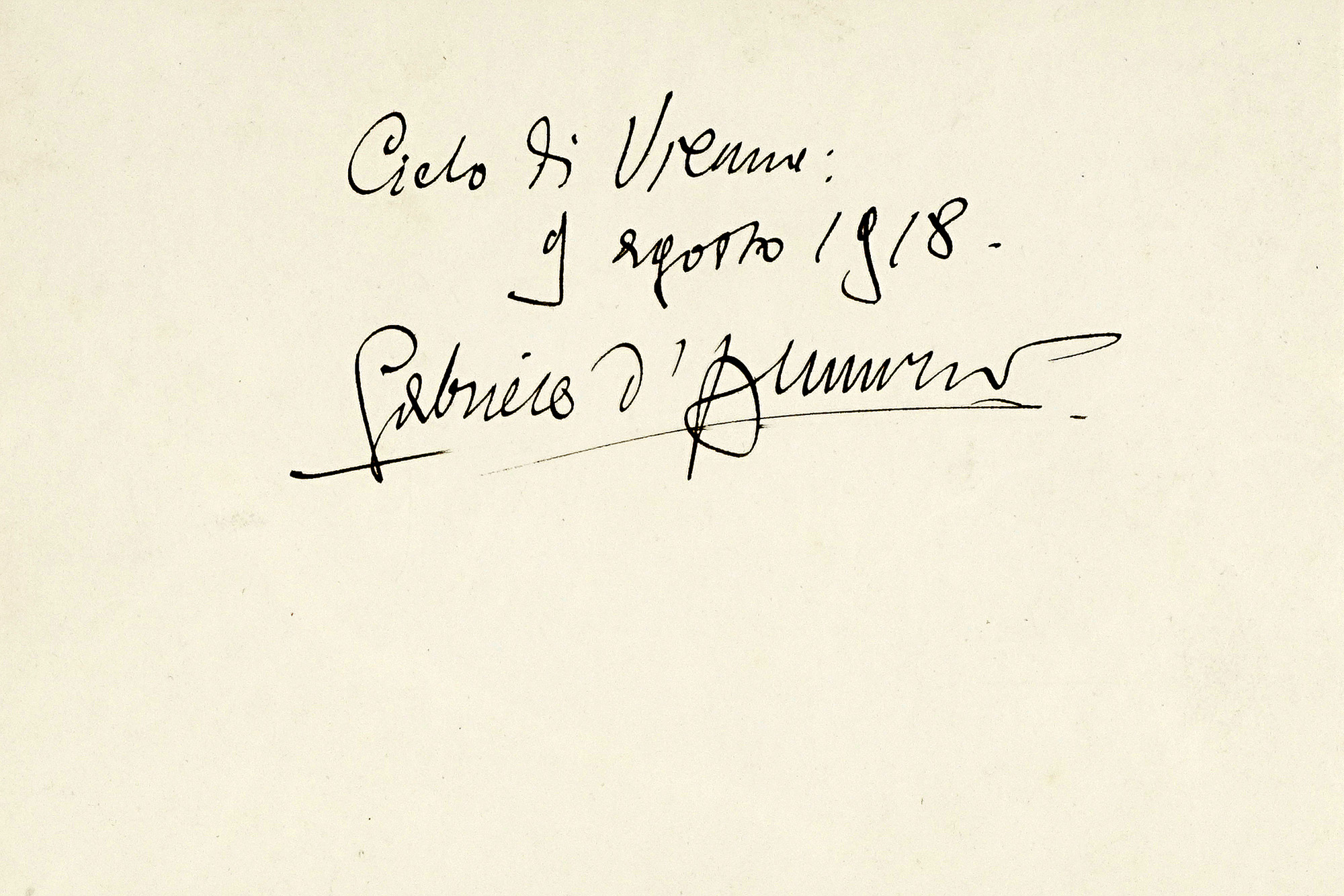 Manoscritto a inchiostro nero. D'annunzio scrive: Cielo di Vienna / 9 agosto 1918 / Gabriele d'Annunzio. Dimensioni 149x214 mm. (1)