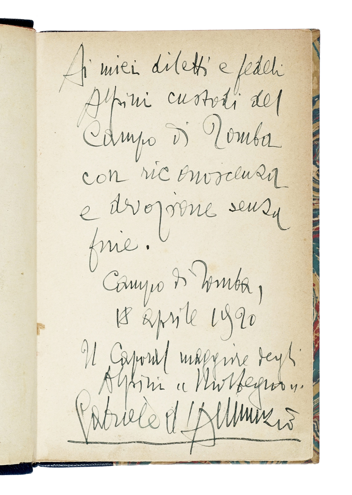 Manoscritto a inchiostro bruno. Elegante legatura in mezza pelle. Piatti in carta marmorizzata. Brossura conservata originale conservata. Dimensioni: 188x122 mm. (1) Dedica autografa: Ai miei diletti e fedeli / Alpini custodi del / Campo di Tomba / con riconoscenza / e devozione senza / fine. / Campo di Tomba, / 18 aprile 1920. / Il Caporal maggiore degli / Alpini Morbegno / Gabriele d'Annunzio.