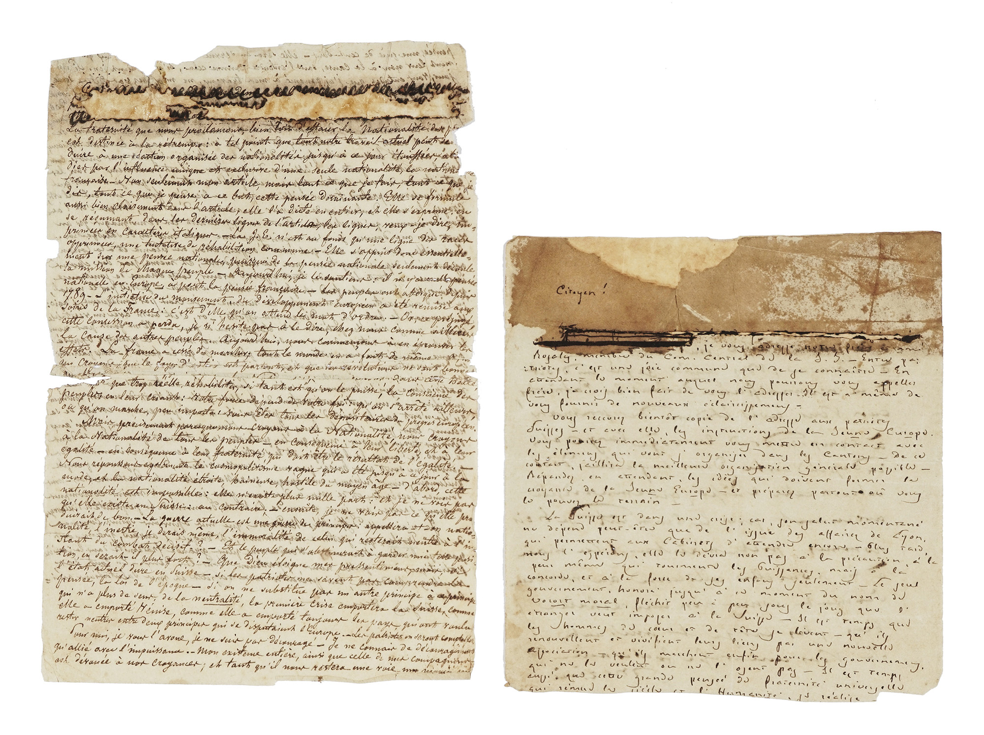 Manoscritto a inchiostro nero. Un bifolio, quattro pagine densamente scritte in francese. Minime lacune che non toccano il testo. Dimensioni bifolio 130x200 mm SI AGGIUNGONO: Id. Appunto cartaceo in francese. Mezza pagina, autografa di Mazzini al recto e di altra mano al verso. Nella parte superiore del documento, antica risarcitura cartacea parzialmente staccata e macchiata. Dimensioni 135x140 mm. Di altra mano, piccolo foglio manoscritto in francese (recto e verso), senza data ma della prima metà dell'800, che tratta delle idee francesi di liberté, egalité e fraternité ed esprime opinioni sulla situazione svizzera e sulla sua neutralità. (3) I DOCUMENTO: Lunga e importante che il trentenne Mazzini scrisse dall'esilio svizzero, esponendo le proprie idee filosofiche e soprattutto i concetti base della Giovine Europa, associazione da lui fondata un anno prima allo scopo di riunire le associazioni nazionali che credevano nell'indipendenza e nella fratellanza, primo embrione della futura Unione Europea. Monsieur, aurez-vous la patience de lire cette longue lettre ? Veuillez l'avoir quelque soient vos préventions contre nous, j'espère que vous ne révoquez pas en doute ma bonne-foi, et la pureté des sentiments qui m'inspirent [...] vous devez entendre mes explications. Moi, je vous les donne [...] parce que notre croyance même nous impose de nous montrer tels que nous sommes et de ne rien cacher aux patriotes de ce que nous voulons, même quand nous n'en espérons pas de fruit. Vous craignez que la J.E. [Jeune Europe] n'ait devancée pour époques. Vous croyez que l'époque sociale doit arriver, mais qu'il faut compter, encore pour beaucoup, peut-être pour les deux tiers, sur l'individualité. Vous voulez donc remonter de l'individualité à l'association. Nous le voulons aussi. L'homme est notre point de départ. L'humanité notre but [...] L'individualité est sainte. L'idée sociale est sainte [...] La J.E. – pour ce point de vue, est une ligne de Nationalités contre un cosmopolitisme vague qui les anéantit [...] Nous avons voulu anéantir ces conséquences : réhabiliter, émanciper les peuples : fraterniser, en d'autres termes, les mettre au niveau l'un de l'autre [...] Cela me conduit à dire deux mots sur la Nationalité Suisse en particulier [...] La Nationalité Suisse peut-elle exister ? oui, Dieu merci : nous le croyons. Il faut pour cela trois choses : une idée qui réunifie [...] une idée qui vous donne la force et [...] le poids en Europe que vous n'avez pas eu jusqu'ici – enfin, la récognition des peuples [...]. Nel prosieguo della lettera Mazzini espone in dettaglio le sue idee di suddivisione geografica della Giovine Europa dei popoli, con la Svizzera al centro. La firma autografa è Jos. [Joseph] Mazzini. II DOCUMENTO: Il testo autografo al recto è una lettera di presentazione di [Gaspare Ordoño de] Rosales, amico di Mazzini e co-fondatore della Giovine Europa. Riassume i concetti mazziniani di fratellanza tra i popoli e alcune considerazioni sulla Svizzera: Citoyen, je vous adresse notre frère et ami Rosales, membre du Com. Centrale de la J.E. Entre patriotes, c'est une joie commune que de se connaitre. En attendant le moment auquel nous pourrons vous appeler frère, je crois bien fait de vous l'adresser [...] vous recevrez bientôt copie de l'adresse aux patriotes suisses – et avec elle, les instructions de la Jeune Europe. Vous pouvez immédiatement vous mettre en contact avec les éléments qui vont s'organiser dans les Cantons [...] La Suisse est dans une crise [...]. Al verso, sempre in francese, un testo con frasi di riconoscenza de tous le patriotes e considerazioni sulla Svizzera, con in calce una firma Mazzini non autografa.