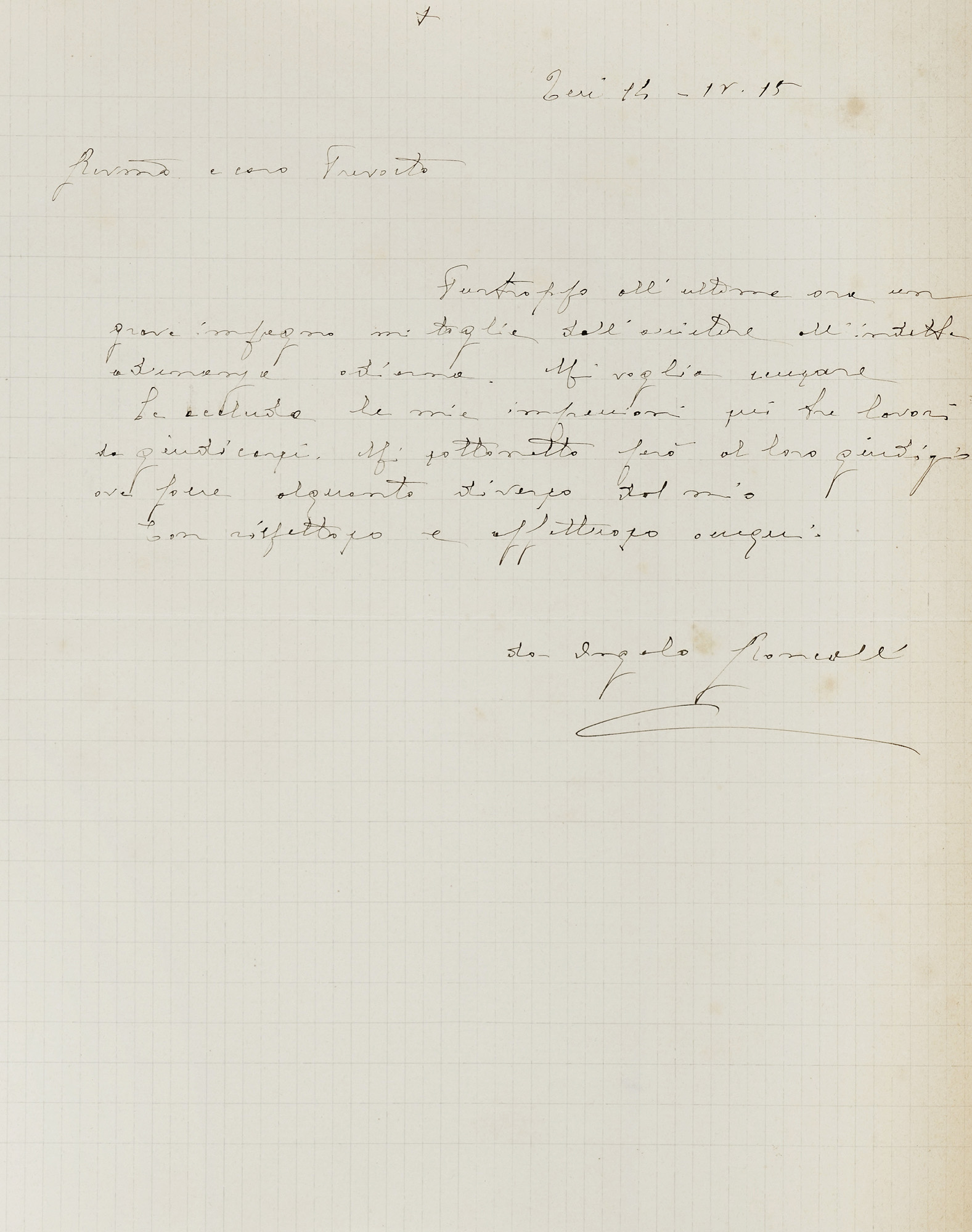Manoscritto a inchiostro nero su carta a quadretti con filigrana. 1 pagina scritta al recto. Dimensioni: 270x215 mm. (4) Nella lettera si legge: "[...] Le accludo le mie impressioni sui tre lavori da giudicarsi. Mi sottometto però al loro giudizio ove fosse alquanto diverso dal mio [...]". Nelle carte allegate, Roncalli commenta i seguenti titoli: The love of liberty brought us here – In te Domine esperavi – La Chiesa è la pienezza del Cristo come Cristo è la pienezza di Dio. Anche l'ultima delle tre carte allegate è firmata.