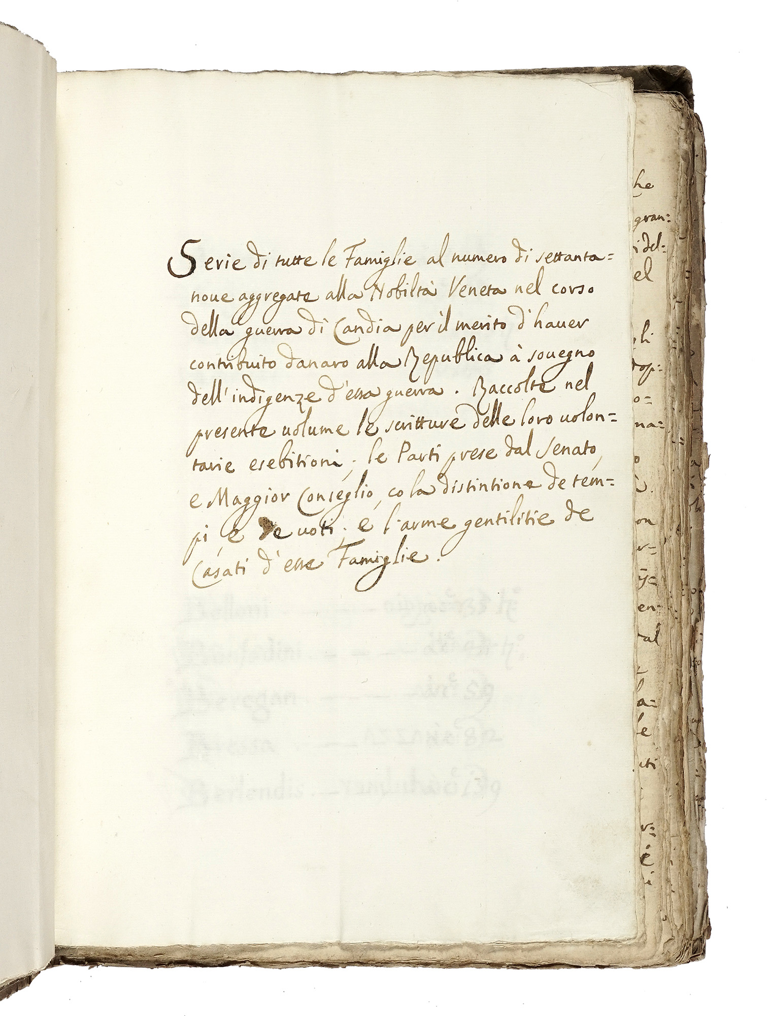 Manoscritto a inchiostro nero. Carte 232 e altri fascicoli non numerati. Alcuni fascicoli staccati dalla legatura. Carte pesanti, in barbe ben conservate. Cartonatura antica. Dimensioni: 300x210 mm (alcuni fascicoli sono di dimensioni inferiori). (1) Nella pagina di apertura del manoscritto si legge: Serie di tutte le famiglie al numero di settanta aggregate alla nobiltà Veneta nel corso della guerra di Candia per il merito d'haver contribuito danaro alla Repubblica à sovegno dell'indigenze d'essa guerra. Raccolte nel presente volume le scritture delle loro volontarie esebizioni; le Parti prese dal Senato, e Maggior Consiglio; e l'arme gentilizie de Casati d'esse Famiglie. Segue un elenco delle famiglie in ordine alfabetico (Antelmi, Angaran, Ariberti [...] Belloni [...] Correggio, Cornaro [...] Della Nave [...] Fini, Ferro [...] Giuponi [...] Labia [...] ecc. In fine all'elenco è scritto: Le seguenti famiglie furono aggregate in tempo del Doge Francesco Molin. Segue una cospicua raccolta di documenti relativa alle varie famiglie. La guerra di Candia fu un lungo conflitto tra la Repubblica di Venezia (e i suoi alleati) e i Turchi. Nel 1645 i turchi sbarcarono nell'isola di Creta e dopo qualche anno la sua principale città, Candia, fu assediata. Durante il lungo assedio, Francesco Morosini diresse coraggiosamente difesa. Dopo la conquista da parte dei turchi (1669), si giunse alla Pace di Candia (1671), che sancì la caduta della città nelle mani dei Turchi. Il conflitto stremò l'economia di Venezia che si basava in larga parte proprio sui commerci con l'Impero ottomano.